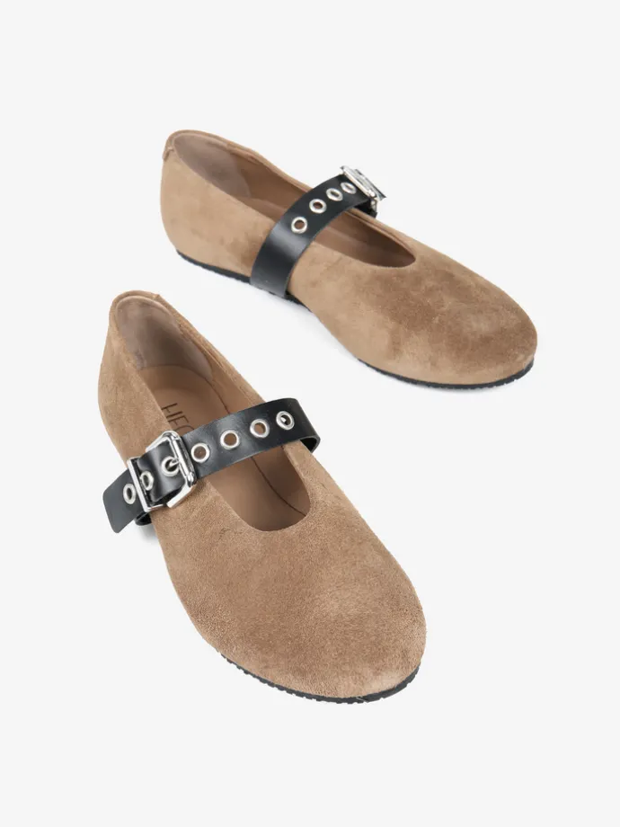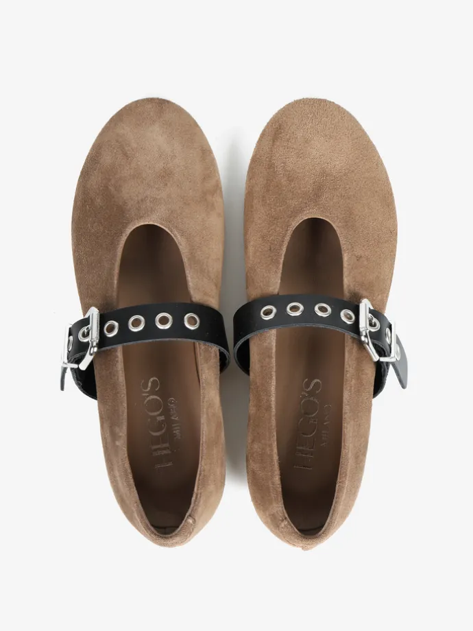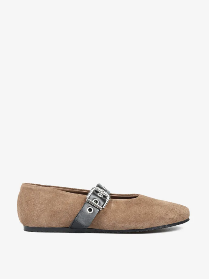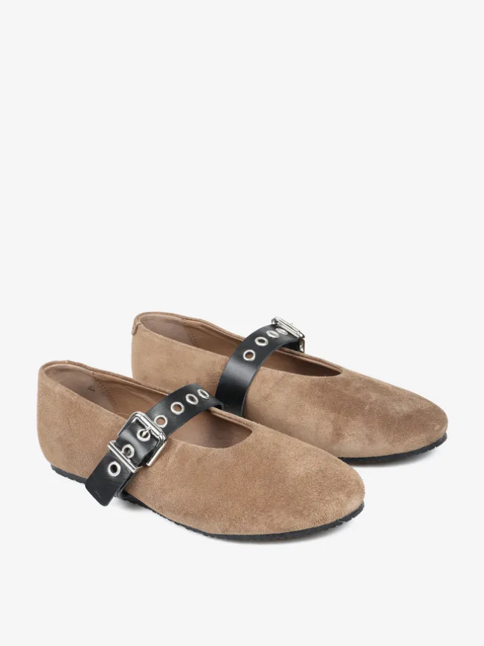 Zamszowe baleriny z regulowanym, skórzanym paskiem. Owalne wycięcie z zabudowanymi brzegami.