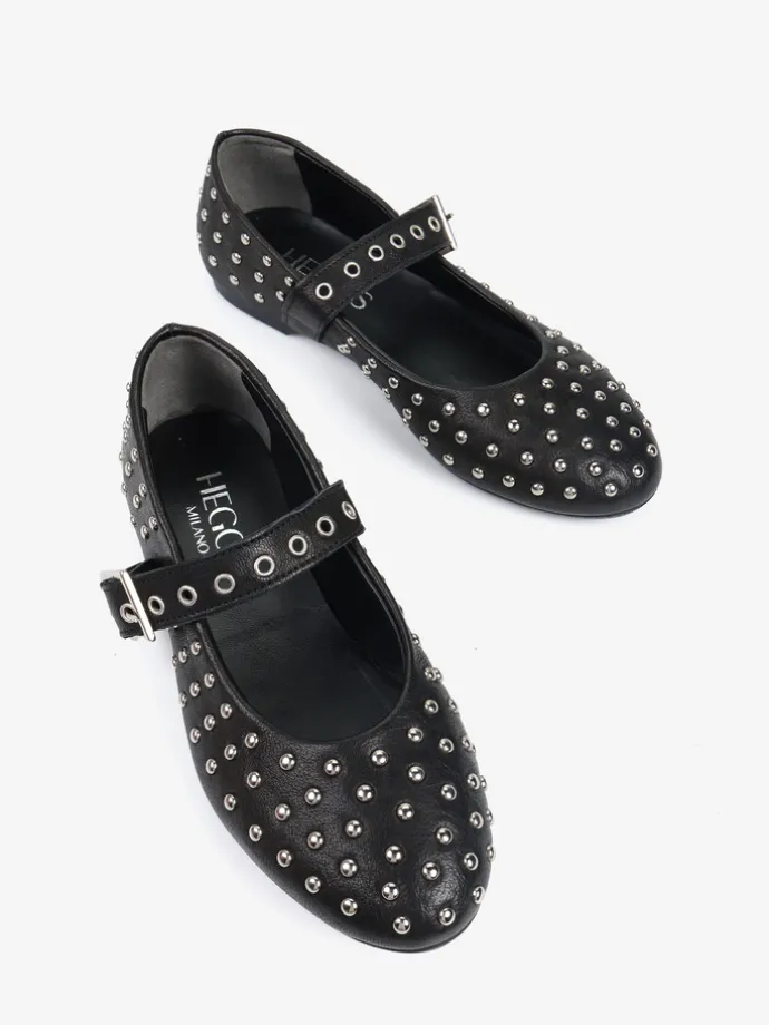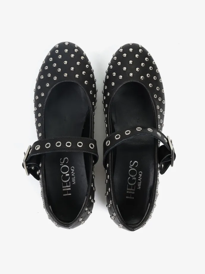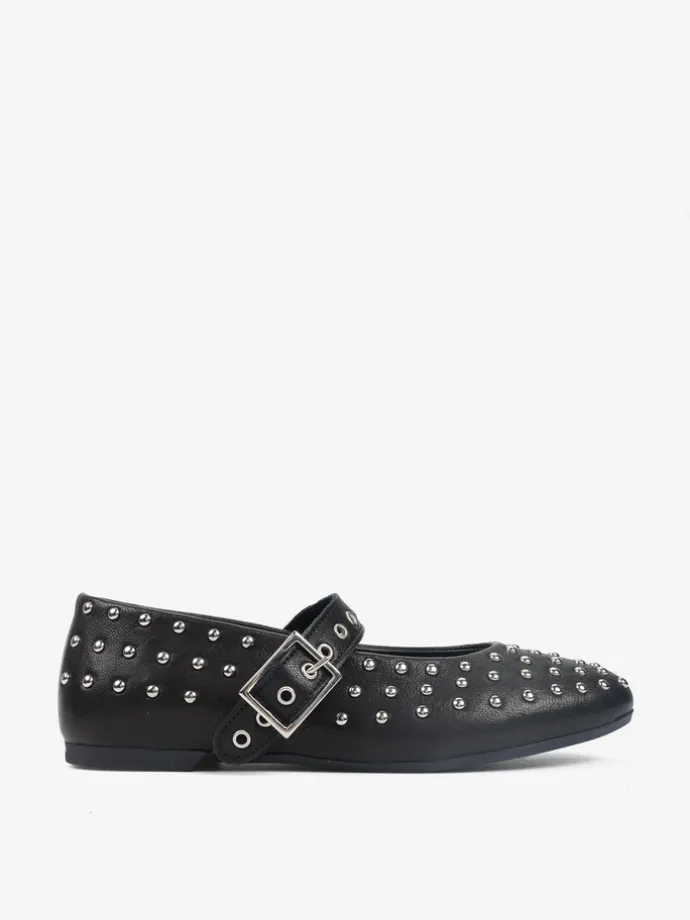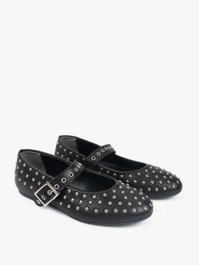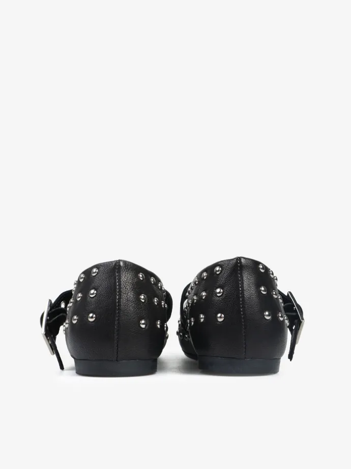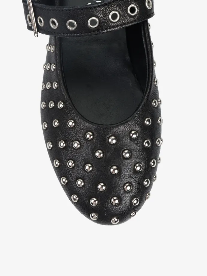 Skórzane baleriny Mary Jane z ozdobnymi ćwiekami. Regulowany pasek.
