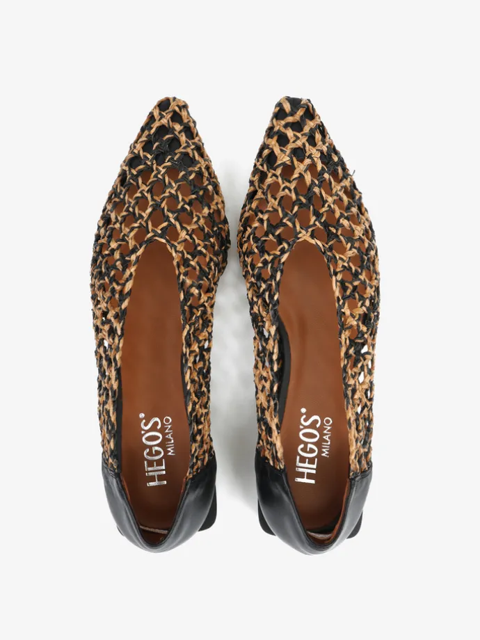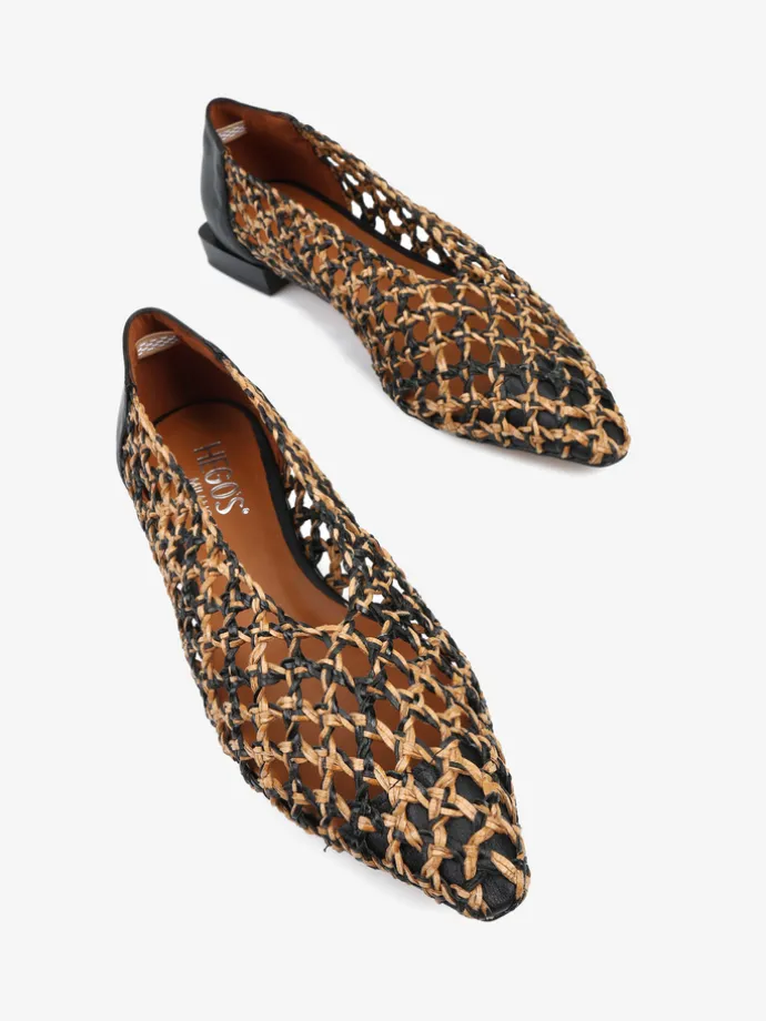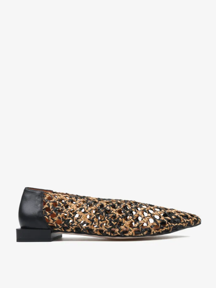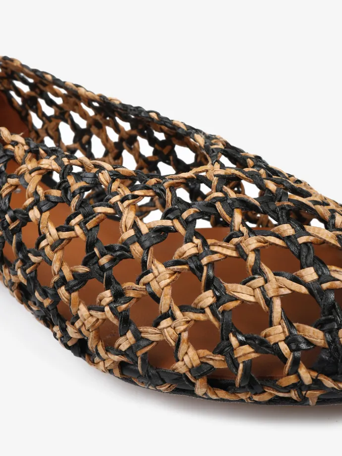 Baleriny z noskiem w szpic wykonane z dwukolorowej, skórzanej plecionki.