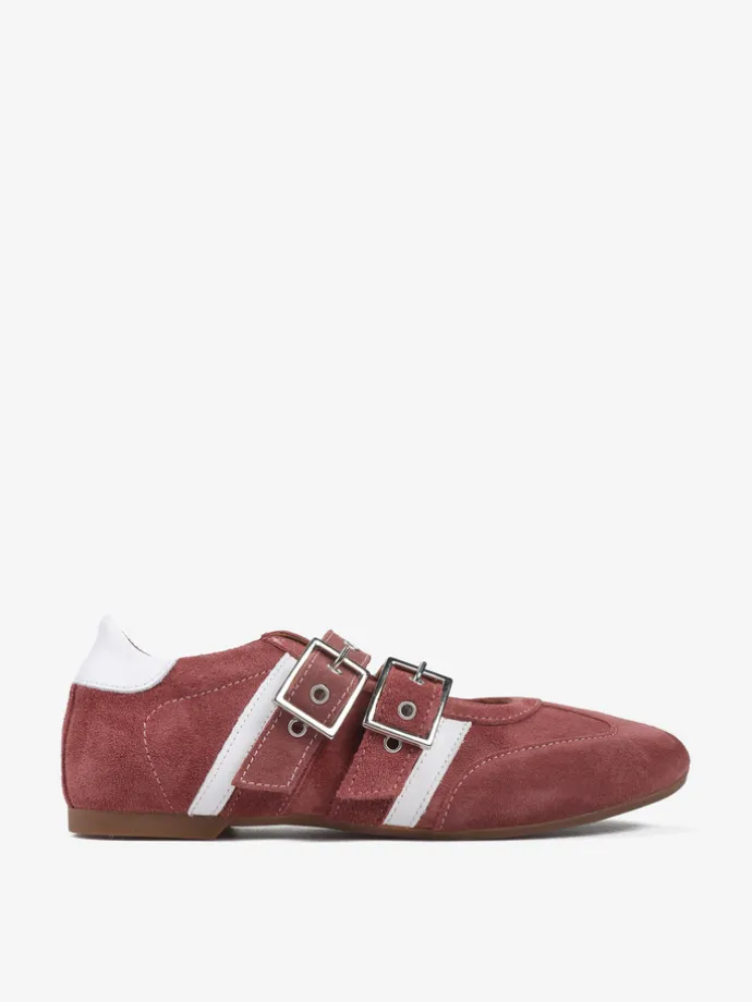 Zamszowe sneakersy z głębokim wycięciem i dwoma regulowanymi paskami. Białe przeszycia ze skóry licowej.
