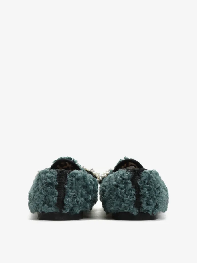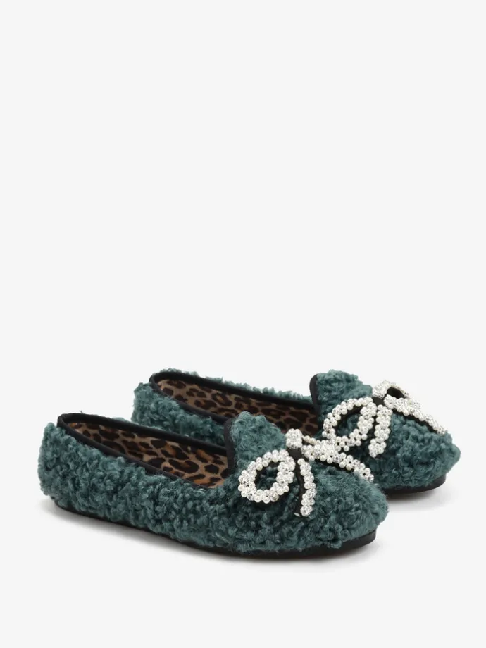 Baleriny wykonane z miękkiej tkaniny imitujacej futro baranka. Ozdobna kokarda z perełkami.