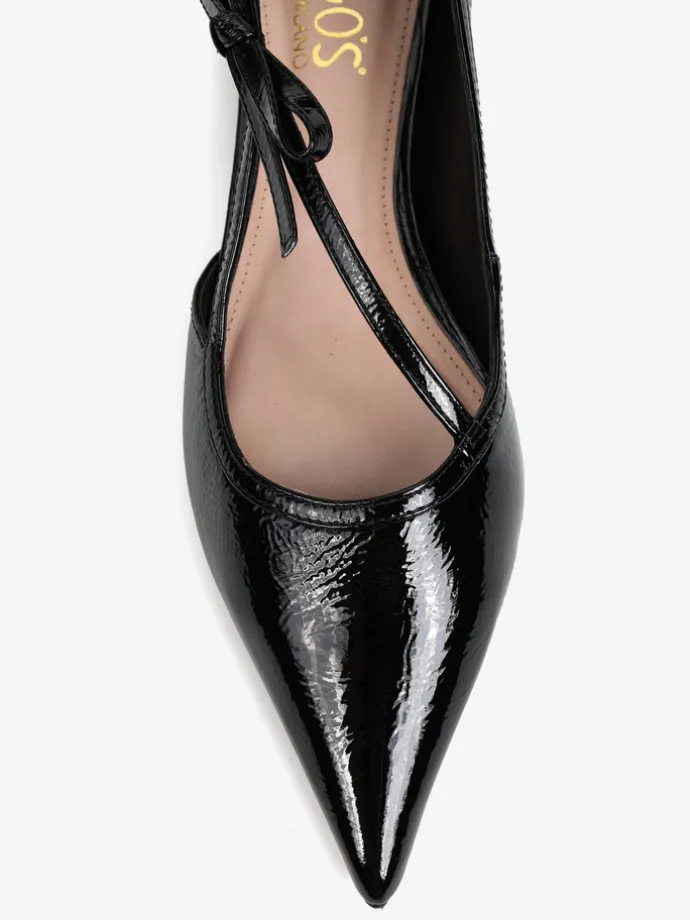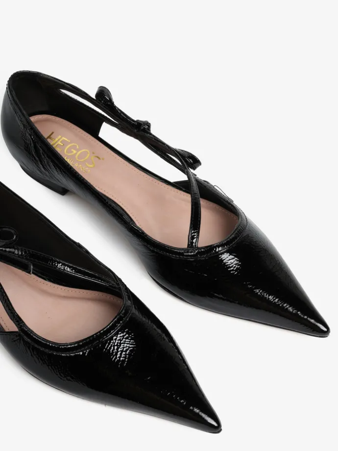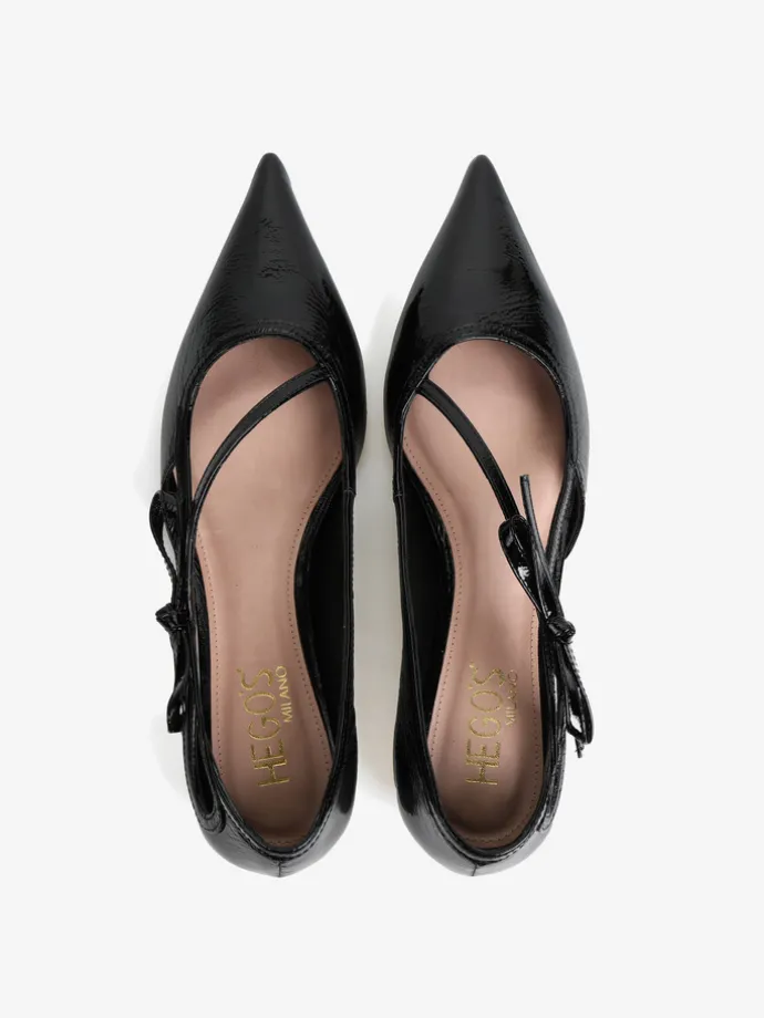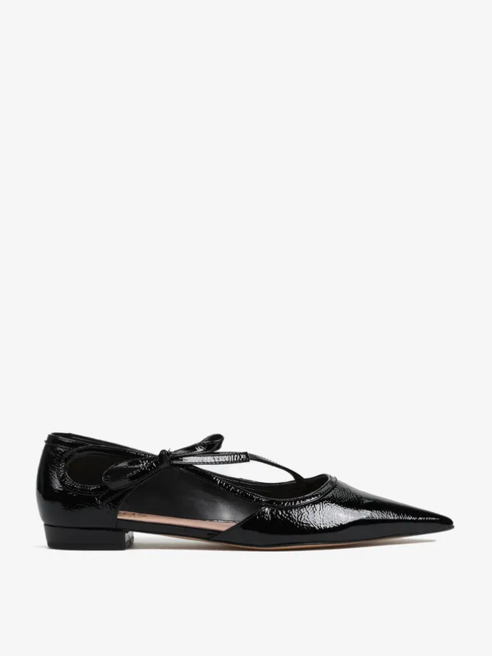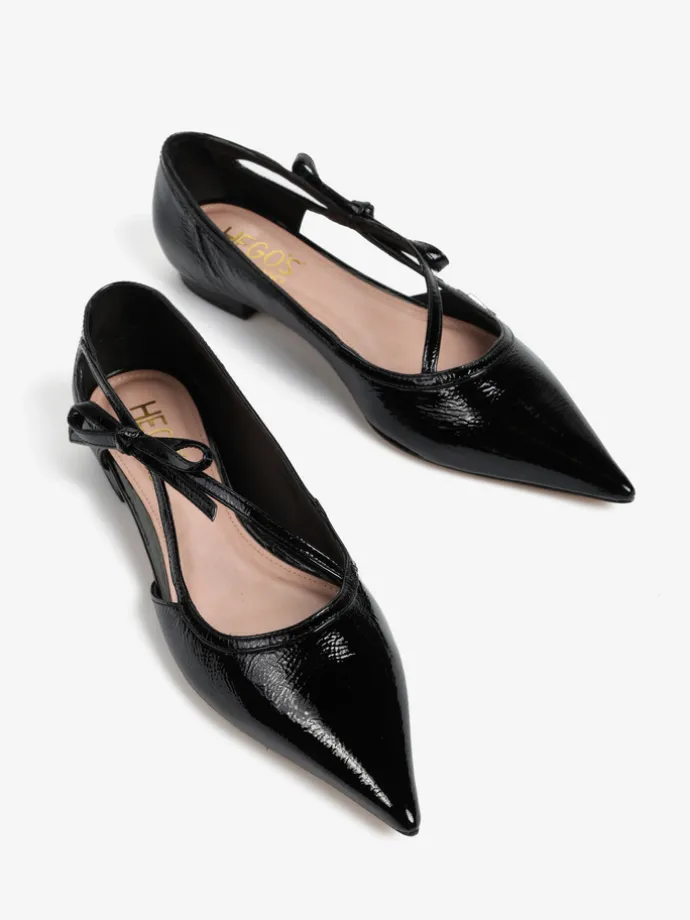 Lakierowane, czarne baleriny z noskami w szpic. Głębokie wycięcie i ozdobny pasek z kokardą.