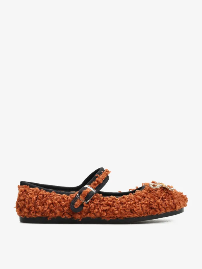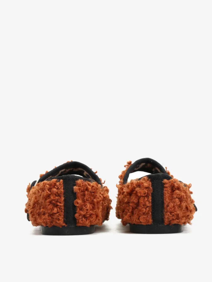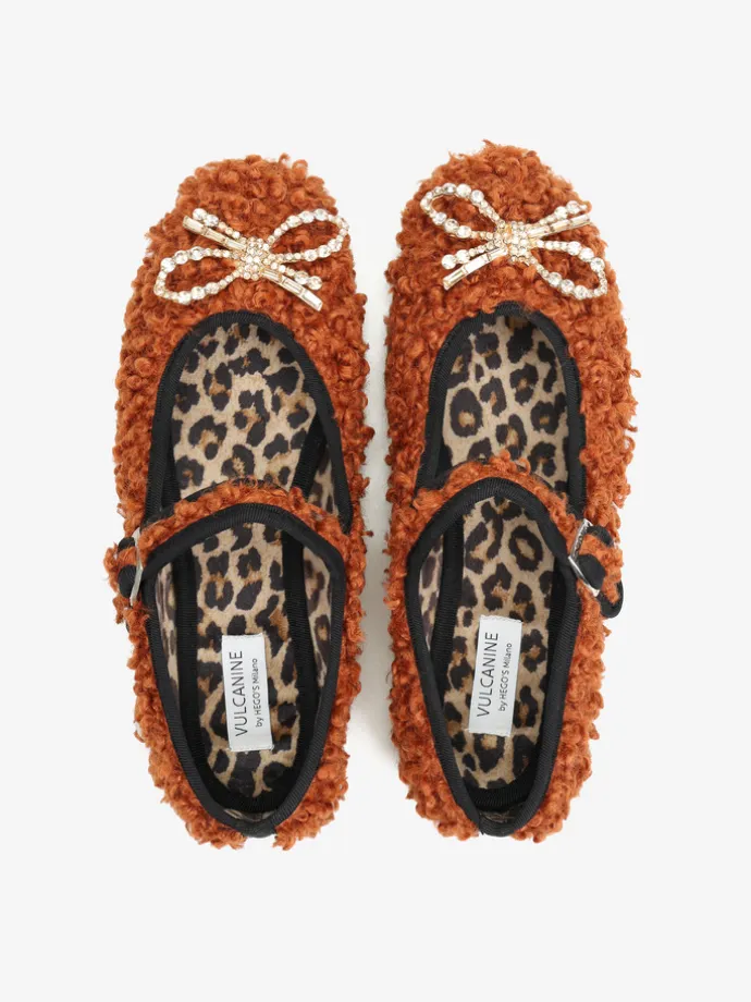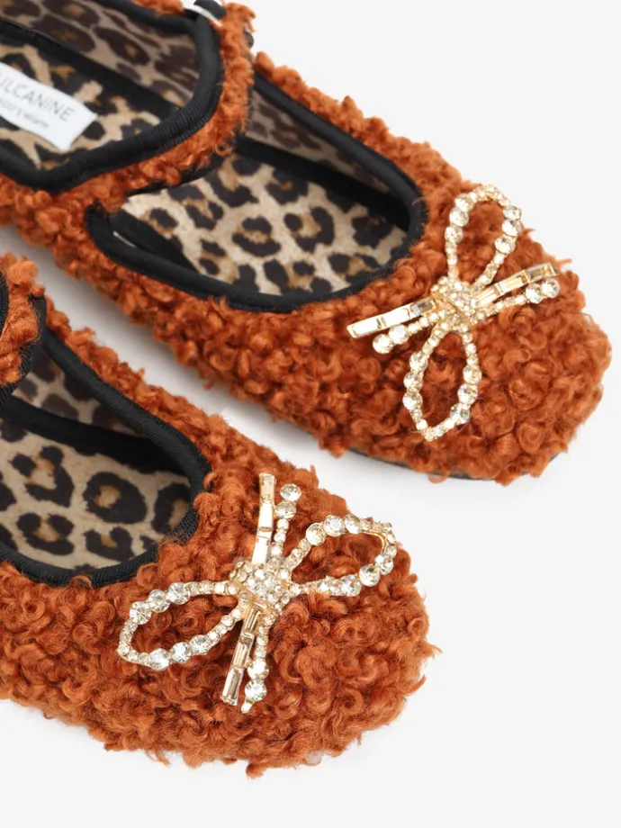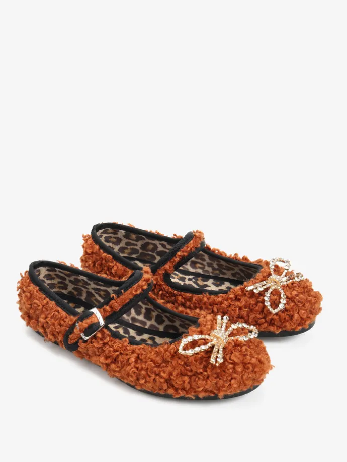Baleriny wykonane z miękkiej tkaniny imitujacej futro baranka. Ozdobna kokarda z kryształkami i regulowany pasek.