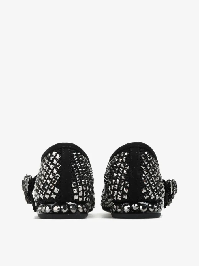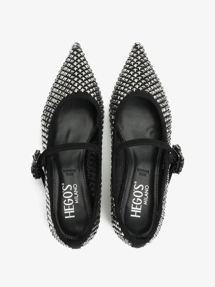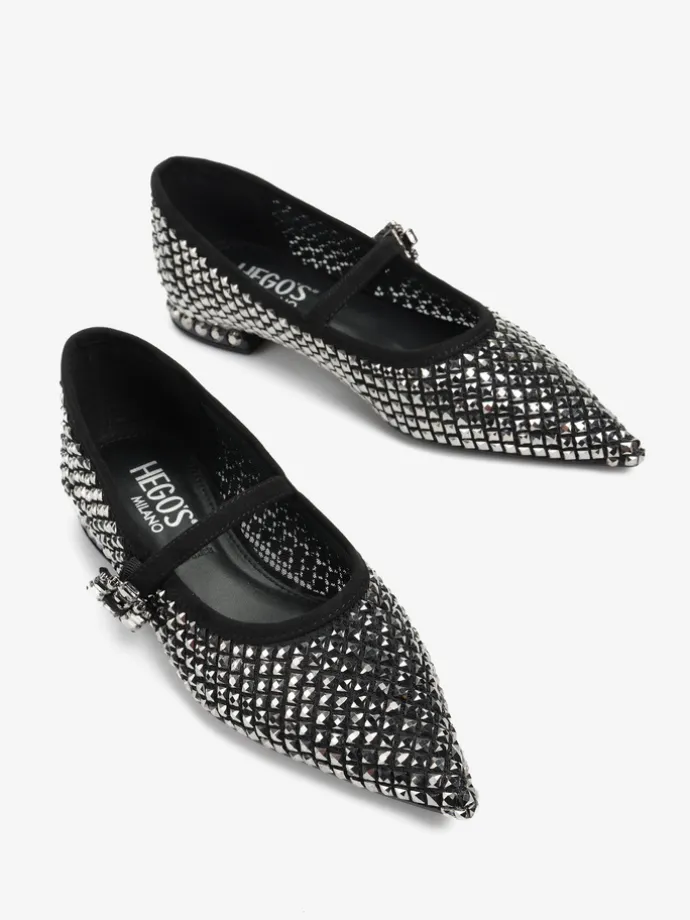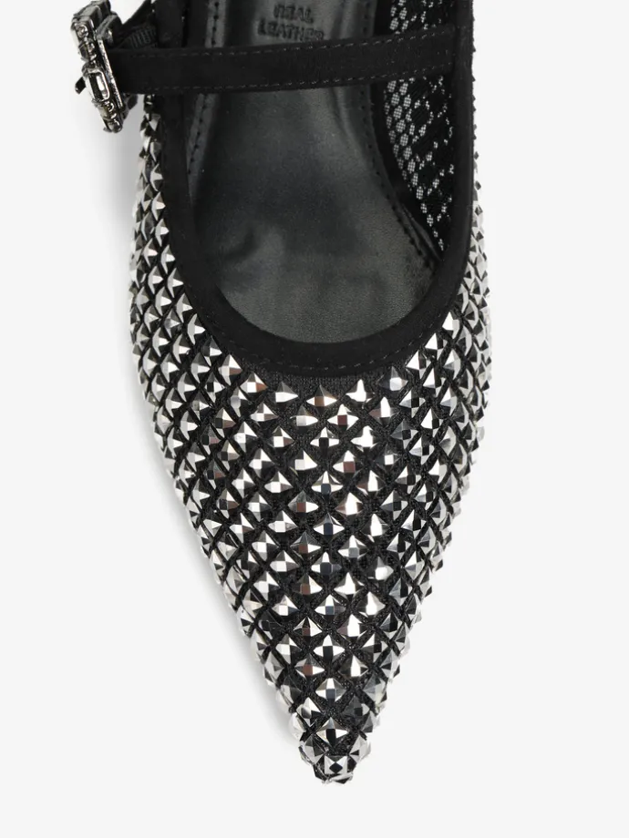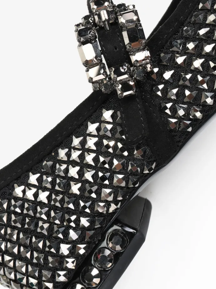 Baleriny Mary Jane wykonane z siateczki zdobionej kryształkami. Noski w szpic, niski obcas i regulowany pasek.