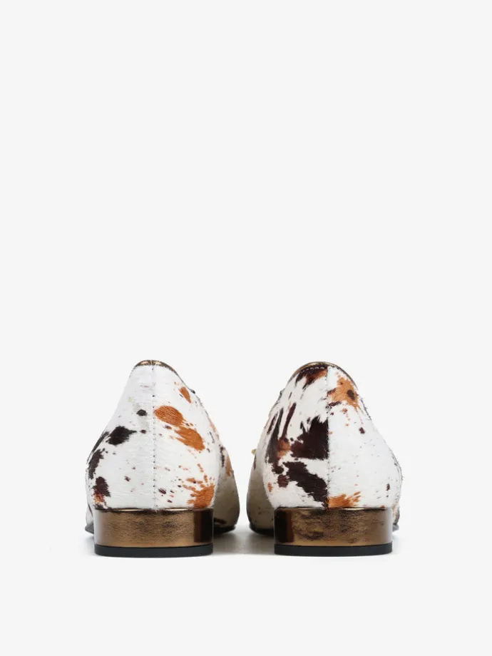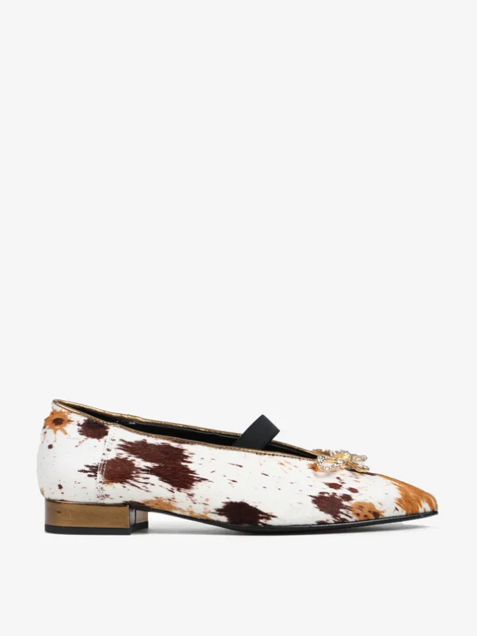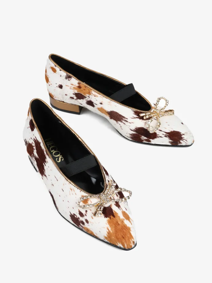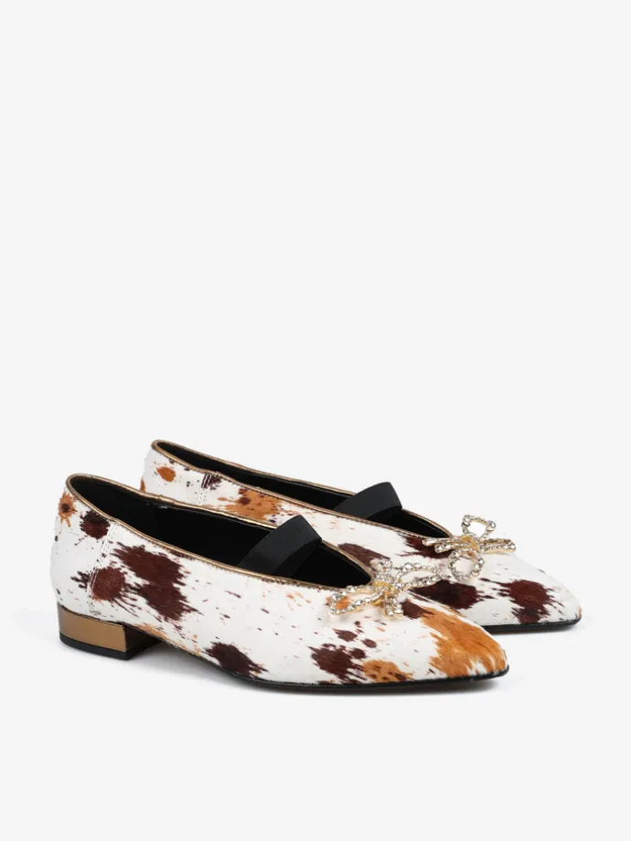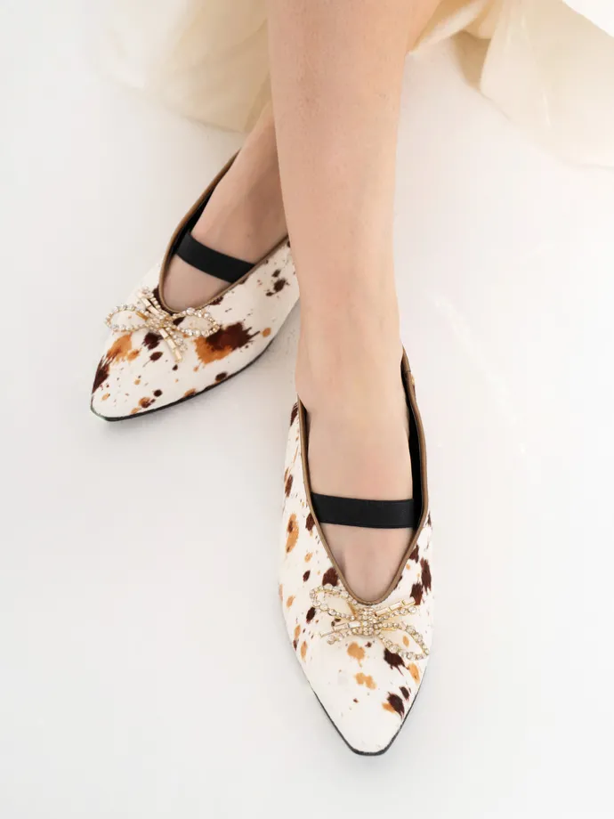 Baleriny z noskiem w szpic i gumką na podbiciu, wykonane z naturalnej skóry z włosiem. Wykończone ozdobną, biżuteryjną kokardą.