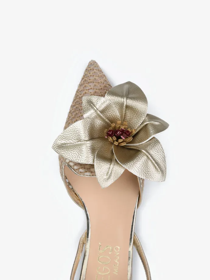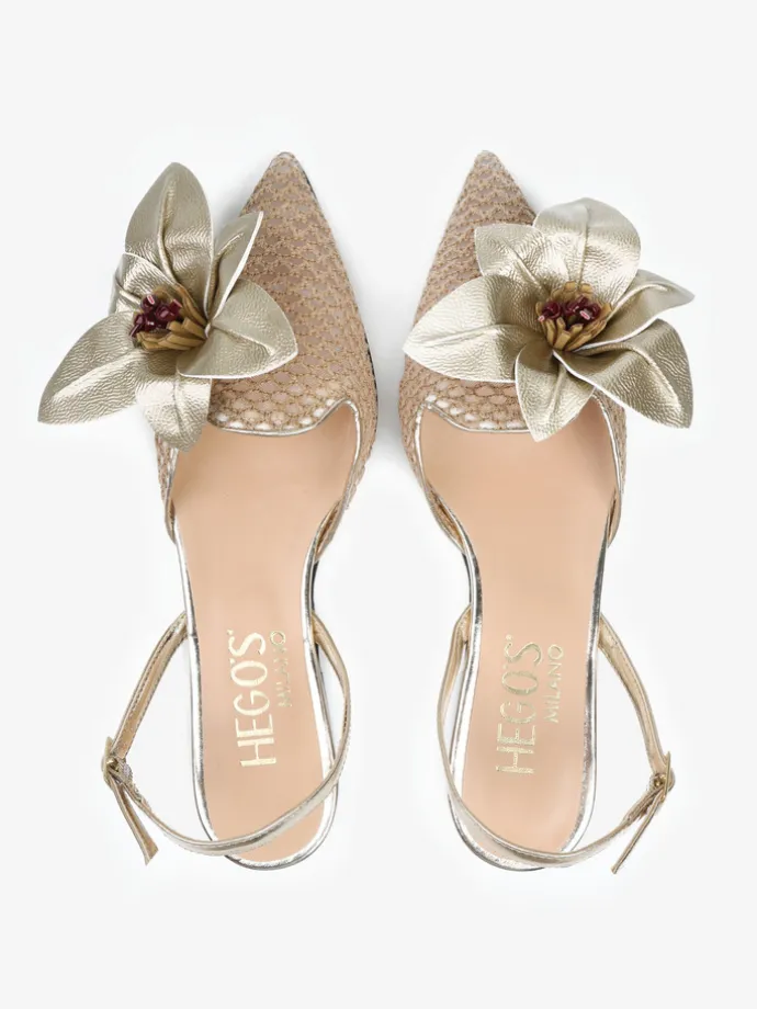 Baleriny z noskiem w szpic z przewiewnej siatczki i ozdobnym kwiatem. Odkryta pięta z regulowanym paskiem.