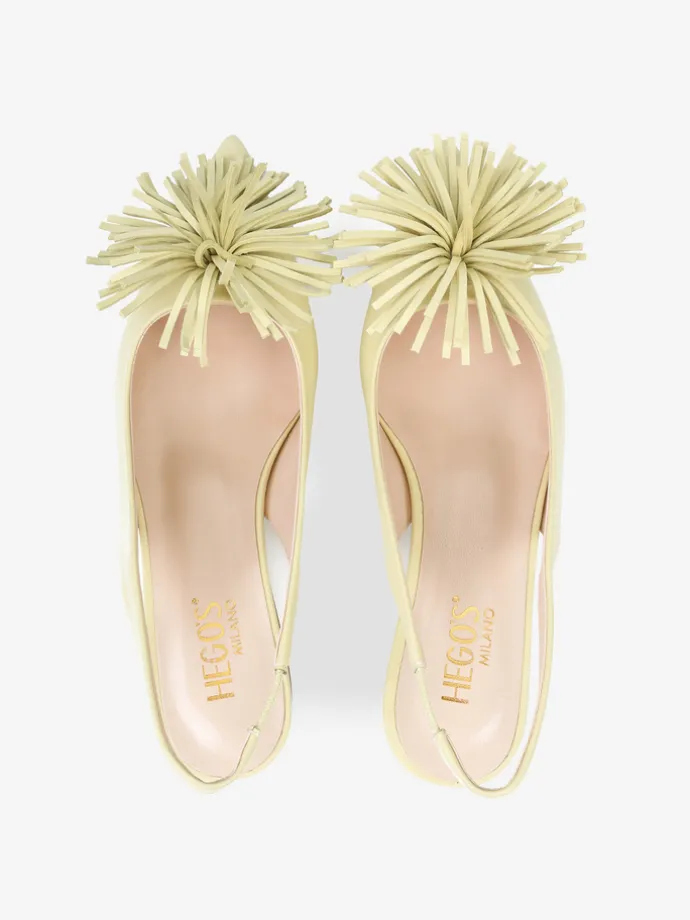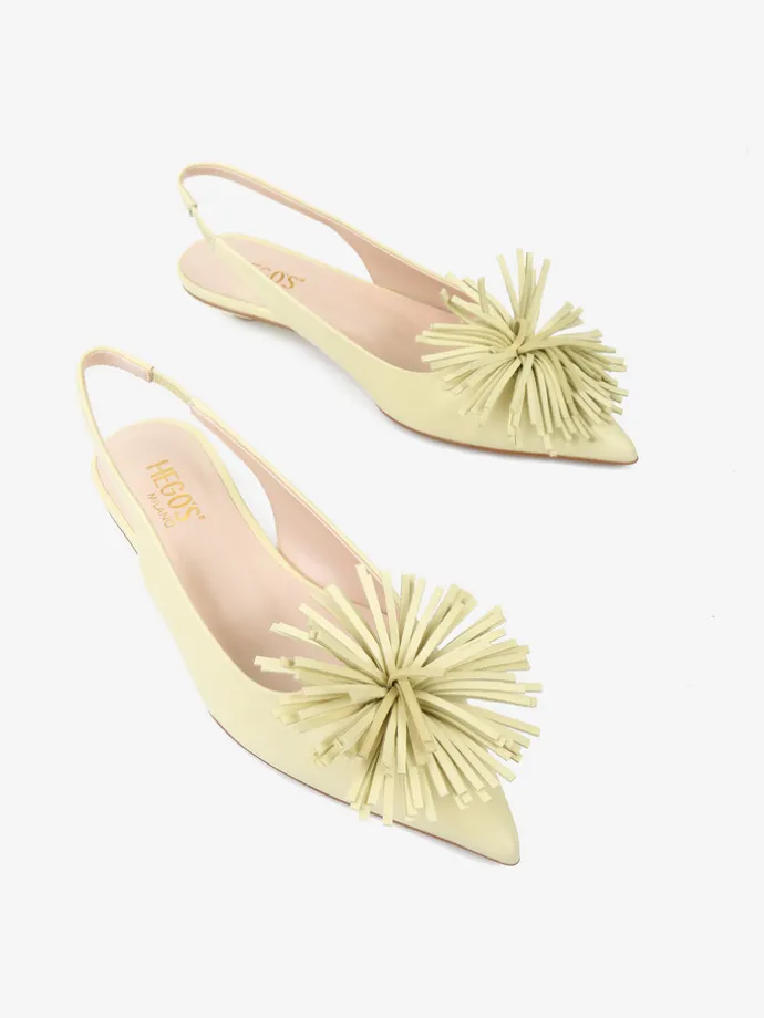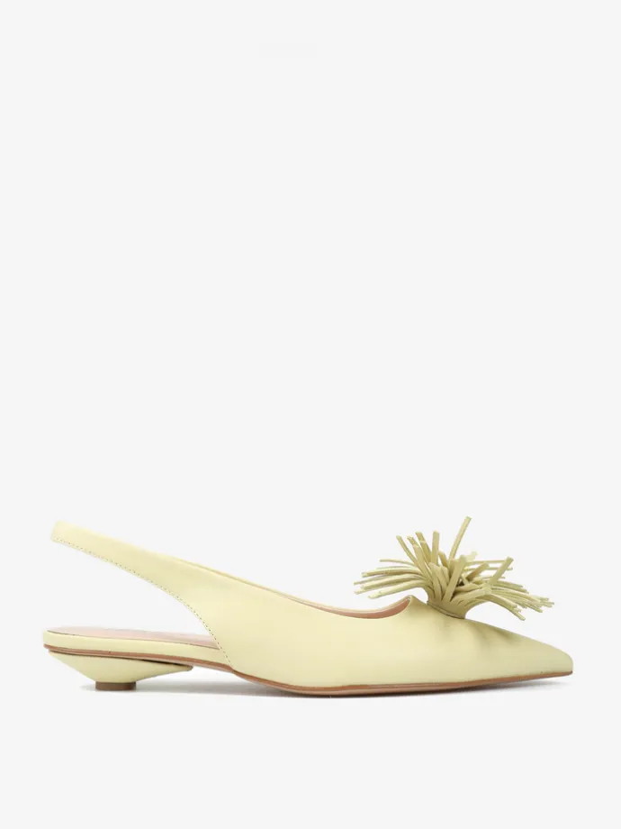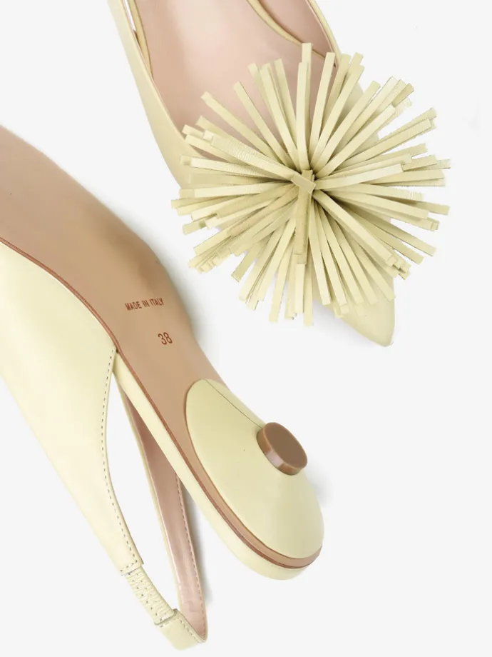 Baleriny z noskiem w szpic i ozdobnym, skórzanym pomponem. Odkryta pięta z paskiem dopasowującym się do stopy.