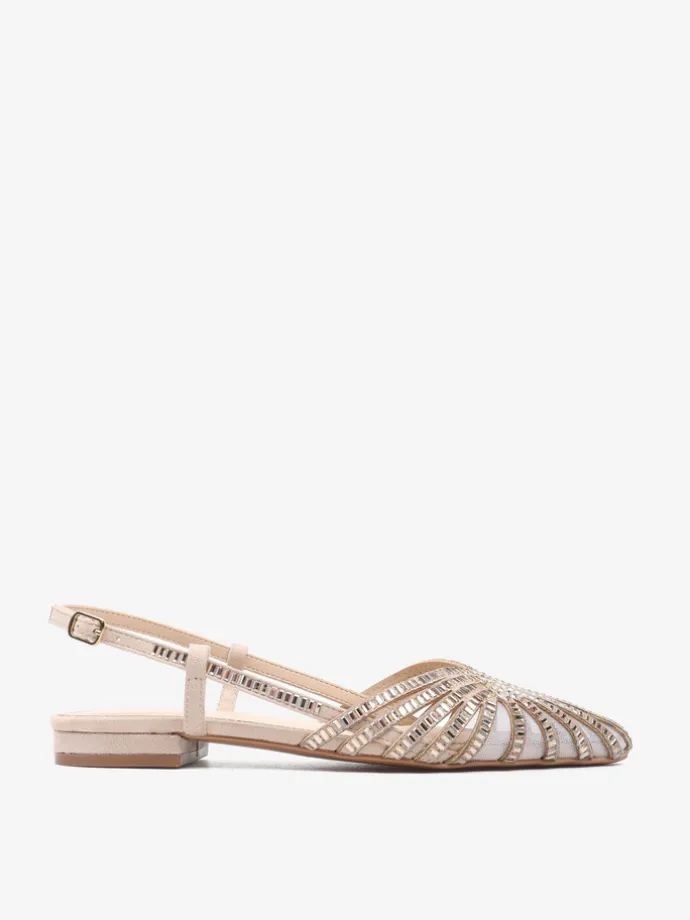 Baleriny z odkrytą piętą z regulowanym paskiem. Ażurowy nosek w szpic z siateczką i ozdobnymi, połyskującymi kamyczkami.