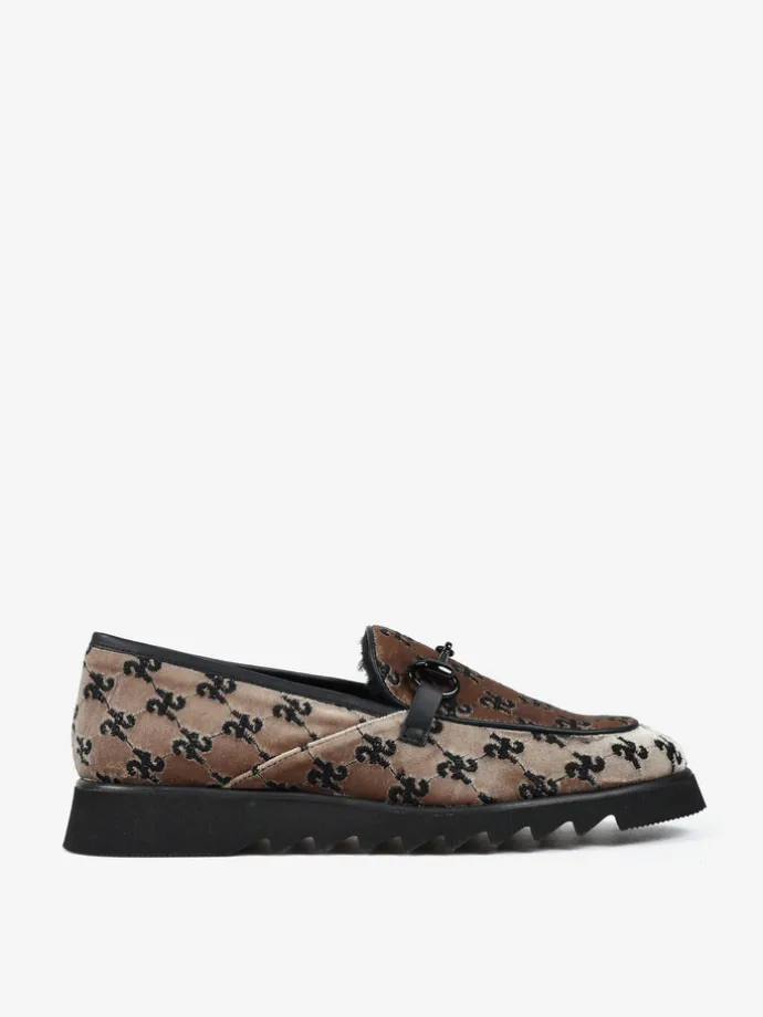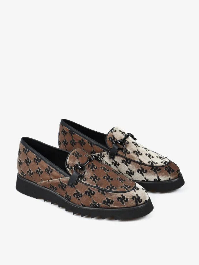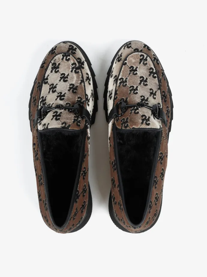 Welurowe mokasyny na efektownej podeszwie z wnętrzem wyłożonym miękkim, sztucznym futrem. Ozdobne wędzidło i haft z monogramem.