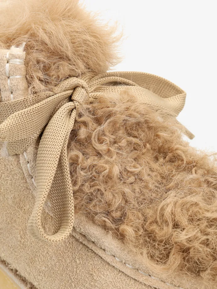 Zamszowe śniegowce na platofmie, wyłożone w środku tkaniną imitującą futro baranka. Wiązanie na sznurowadła.