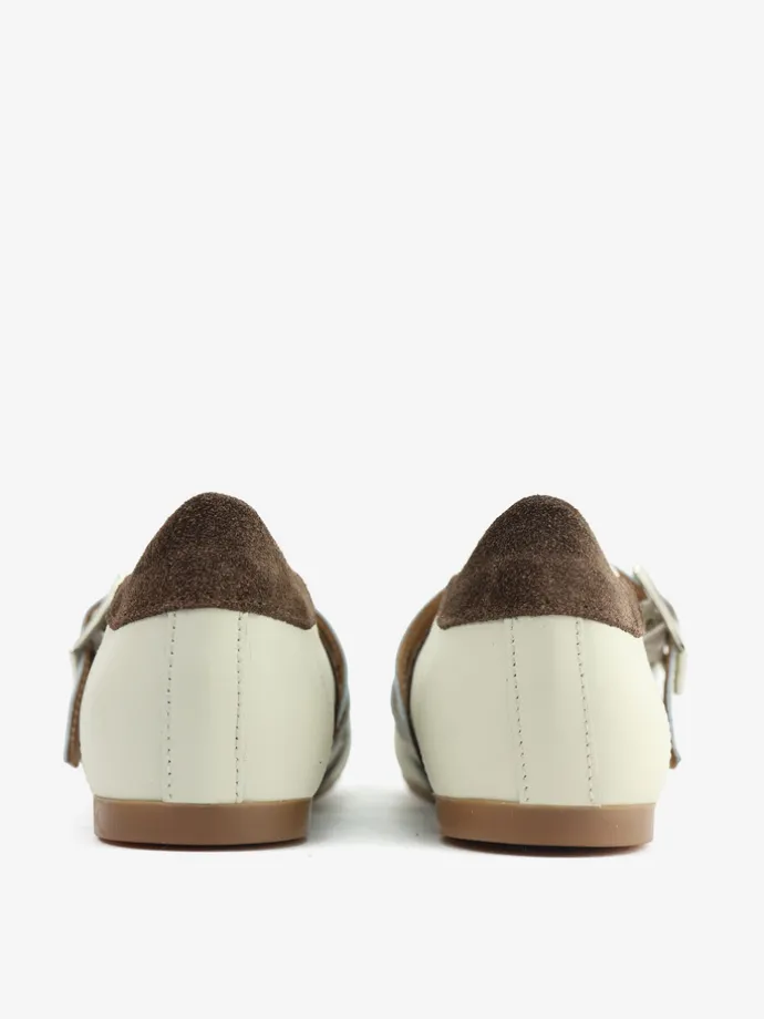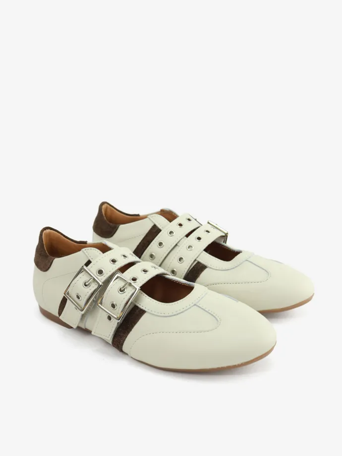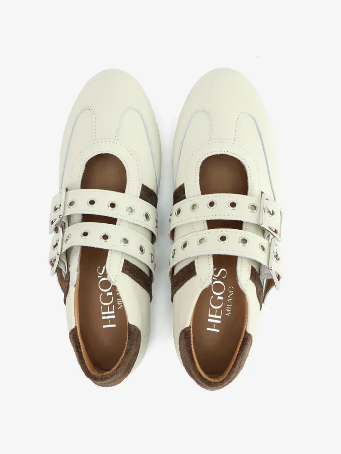 Skórzane sneakersy z głębokim wycięciem i dwoma regulowanymi paskami. Brązowe przeszycia z zamszu.