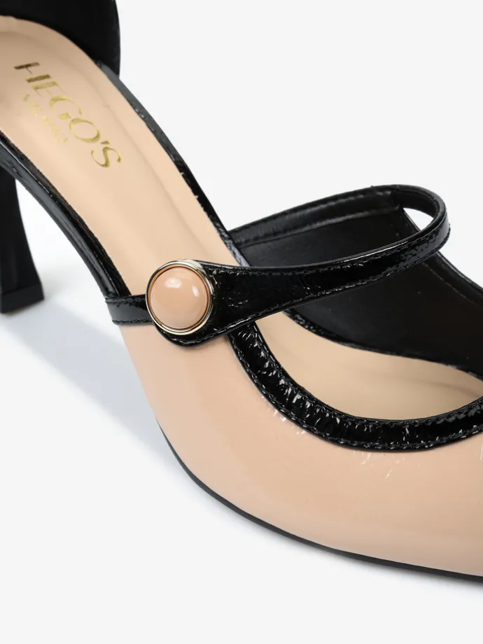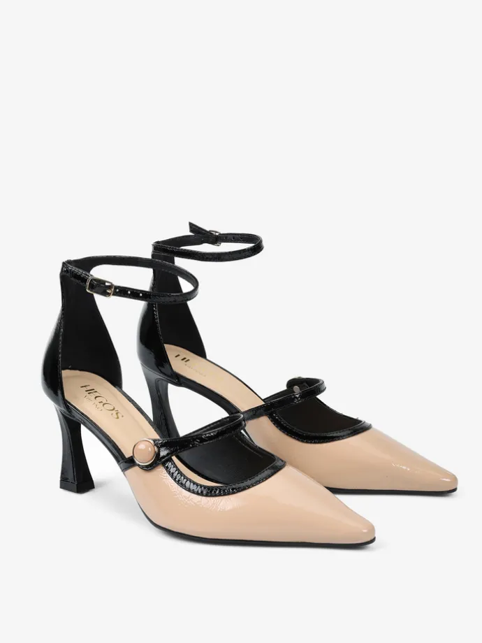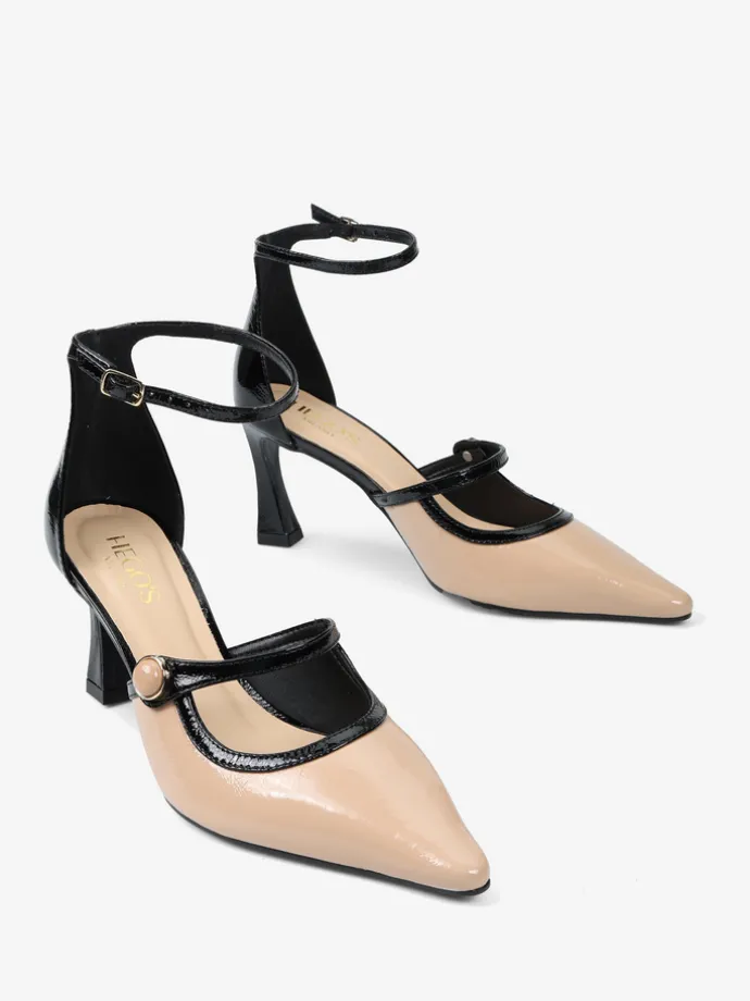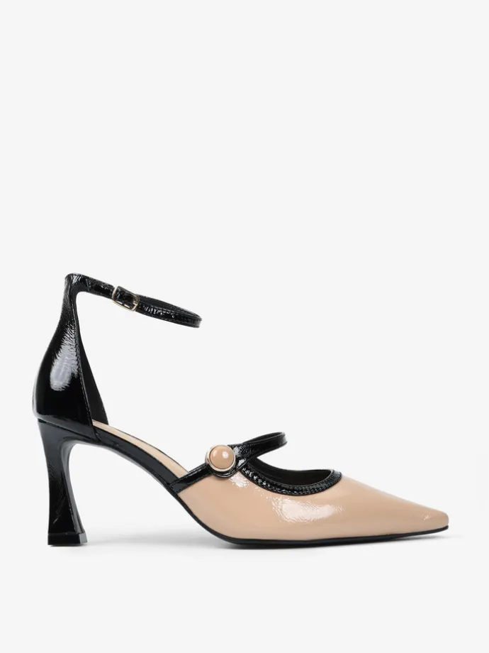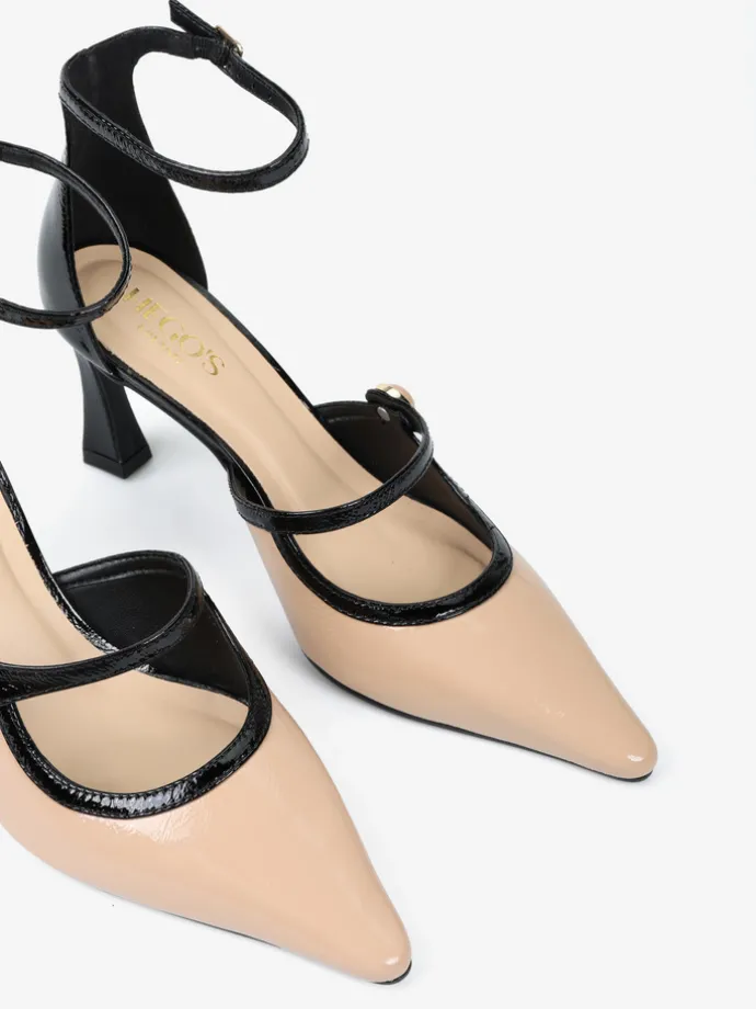Lakierowane szpilki z zakrytą pięta i regulowanym paskiem na kostce. Beżowy nosek w szpic z ozdobnym paskiem.