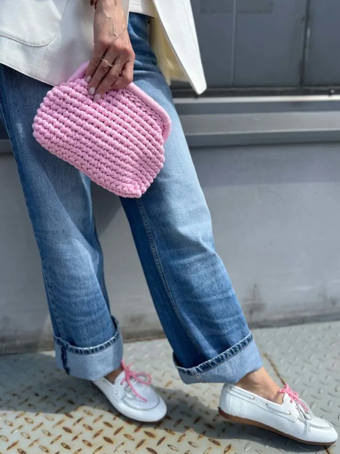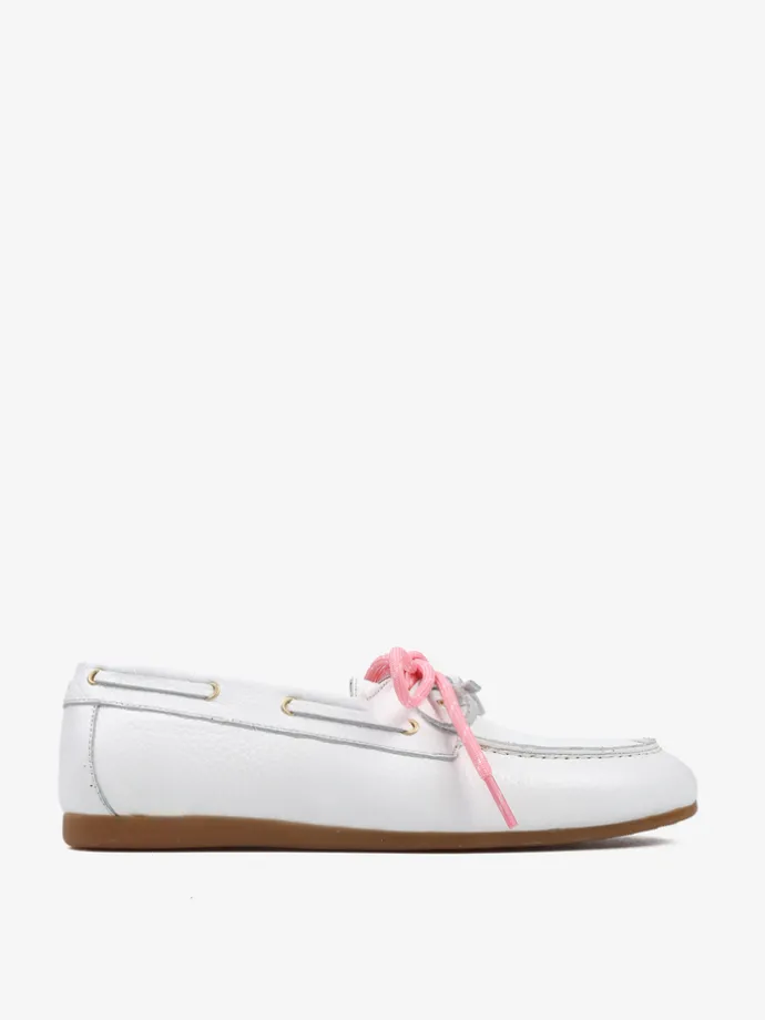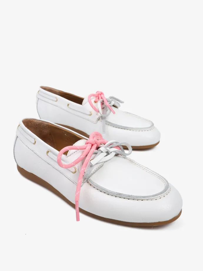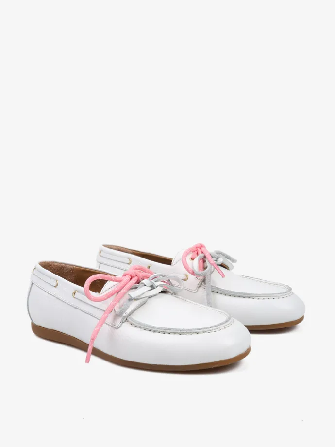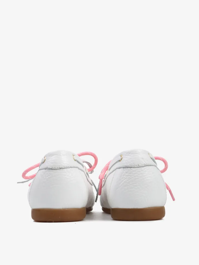 Mokasyny wykonane z białej skóry z wiązaniem pozwalającym na idealne dopasowanie. Dodatkowe sznurowadła w kontrastującym, różowym kolorze.