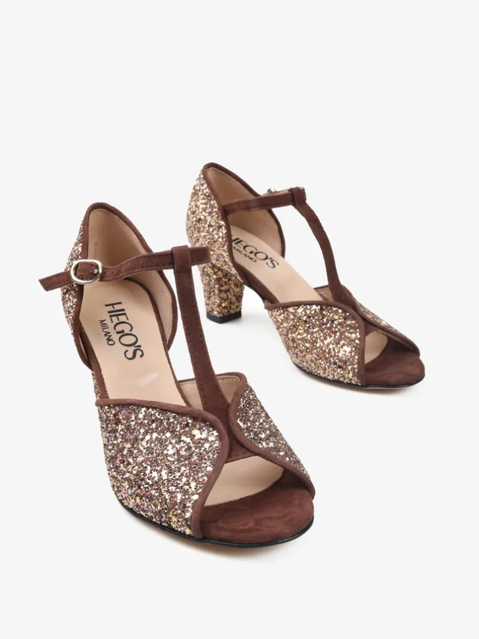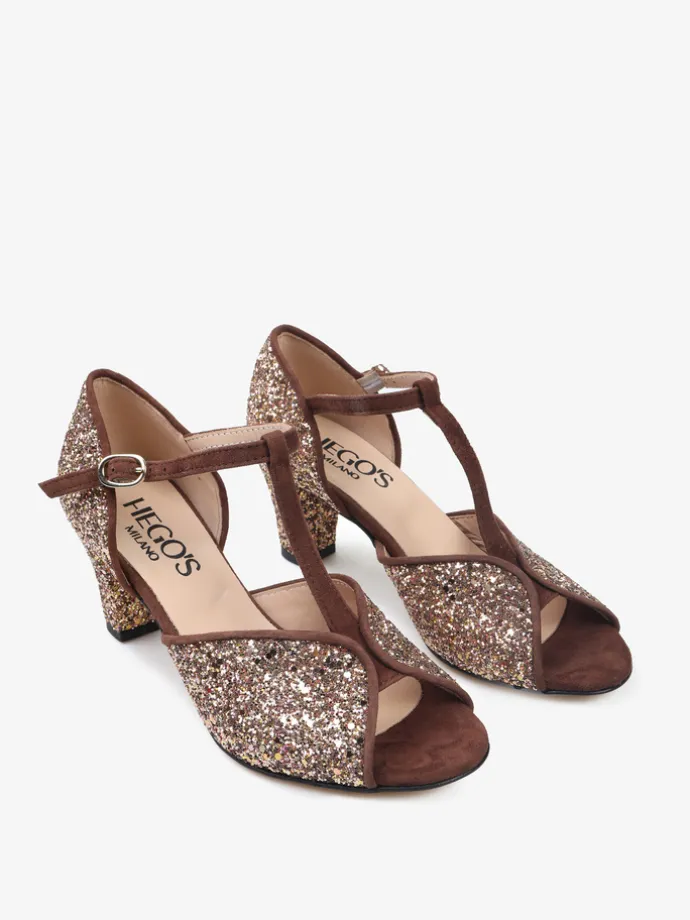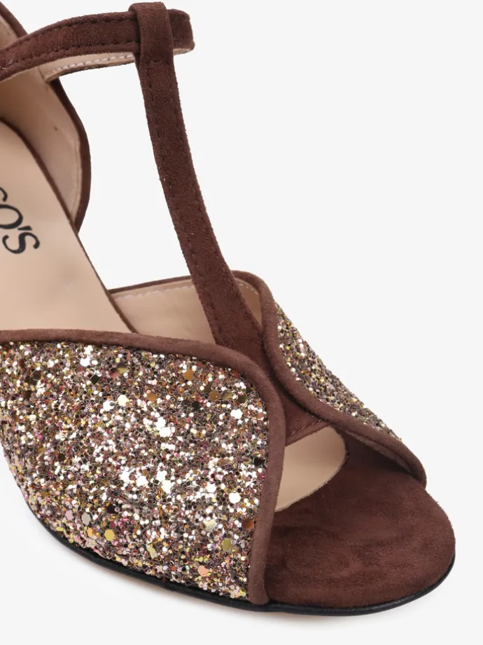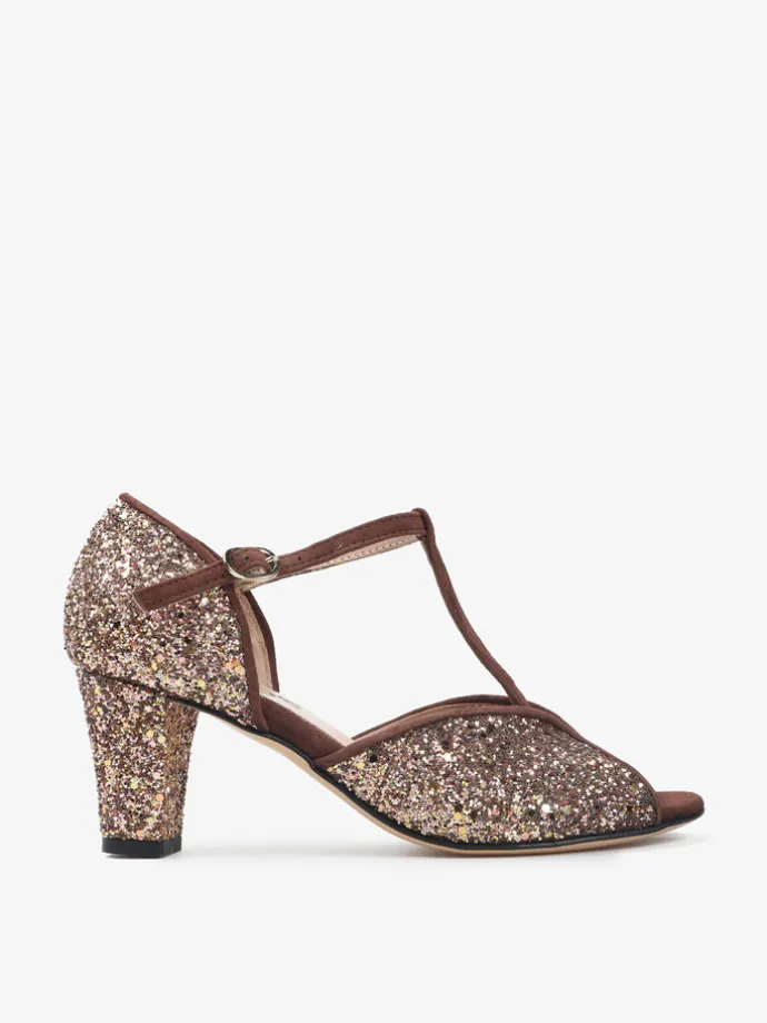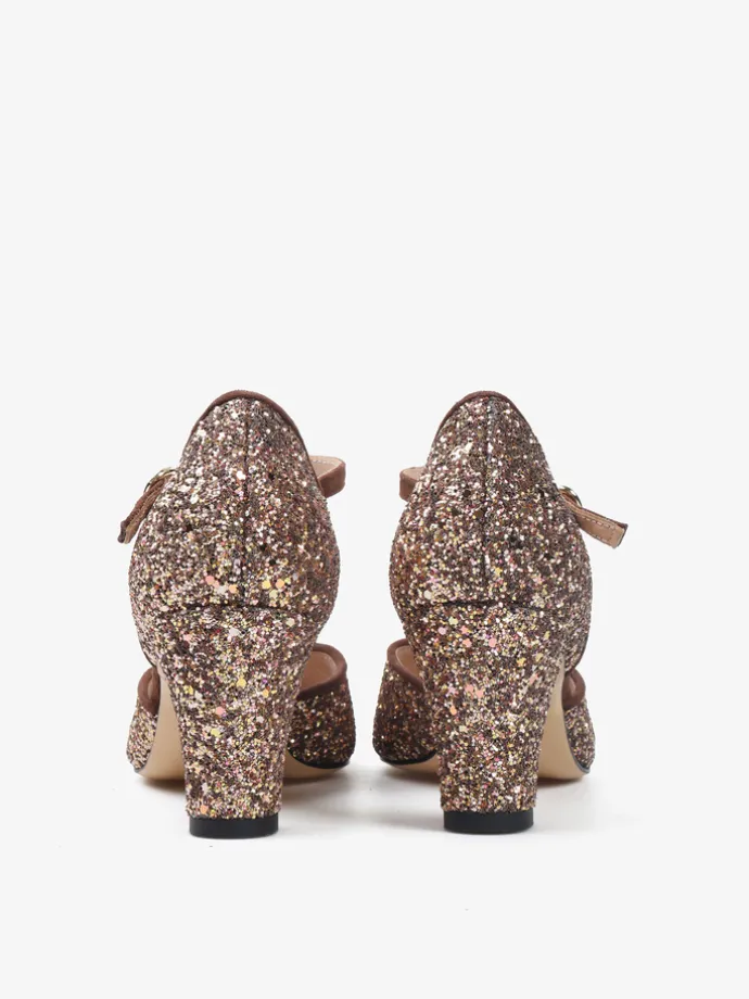 Czółenka peep toe z paskiem na podbiciu i regulowanym zapięciem na kostce. Wykończone gruboziarnistym brokatem.