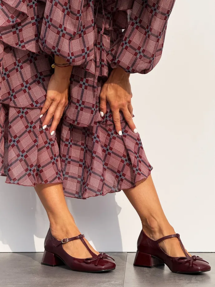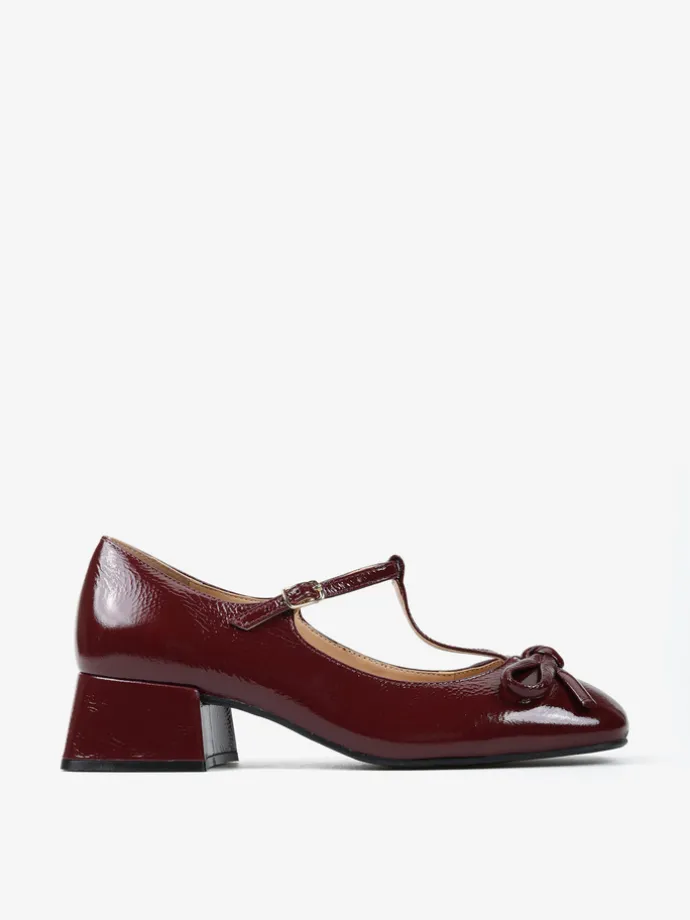 Lakierowane czółenka Mary Jane z paskiem na podbiciu i regulowanym zapięciem. Kwadratowy nosek z ozdobną kokardką.