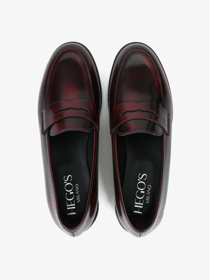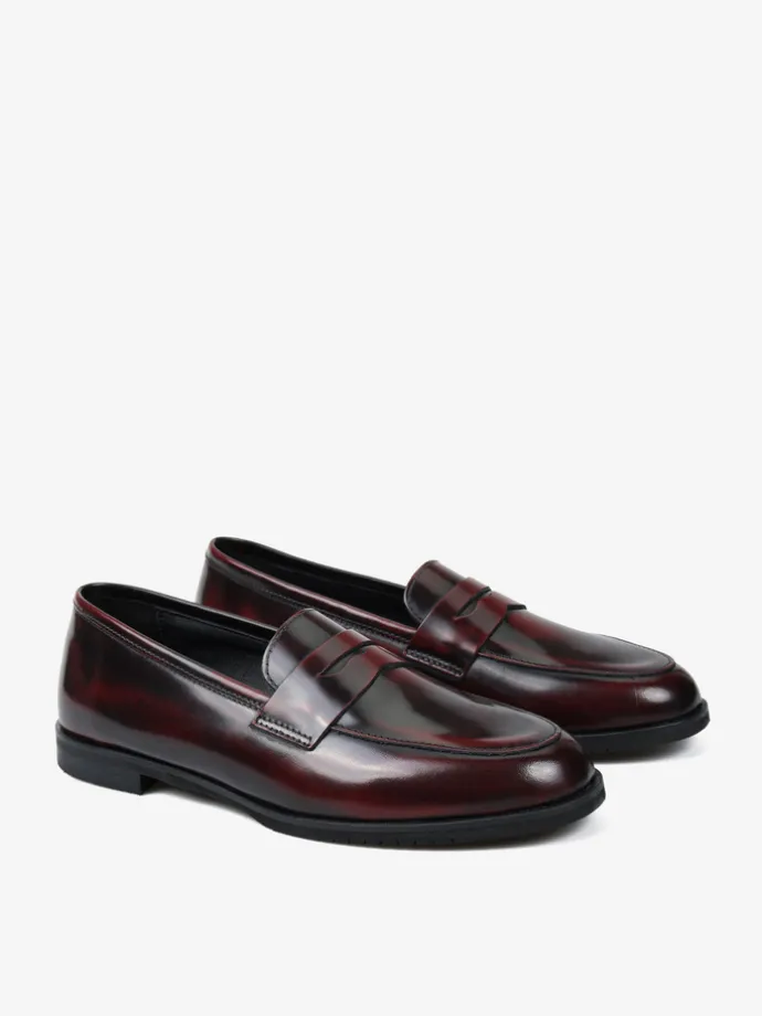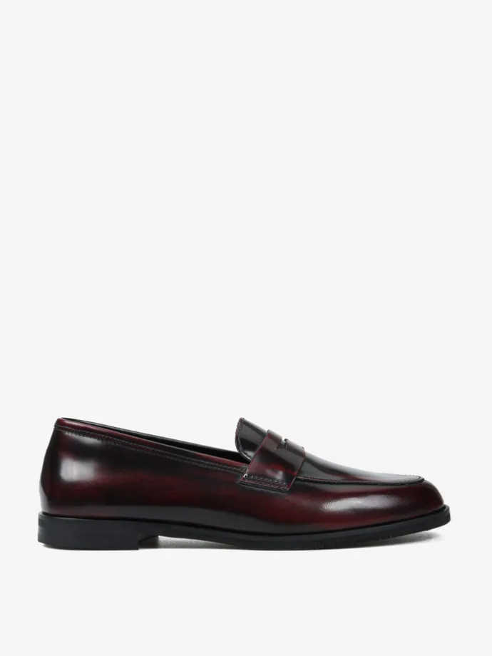 Klasyczne mokasyny z patką, wykonane z wysokopolerowanej skóry z efektem sprania.