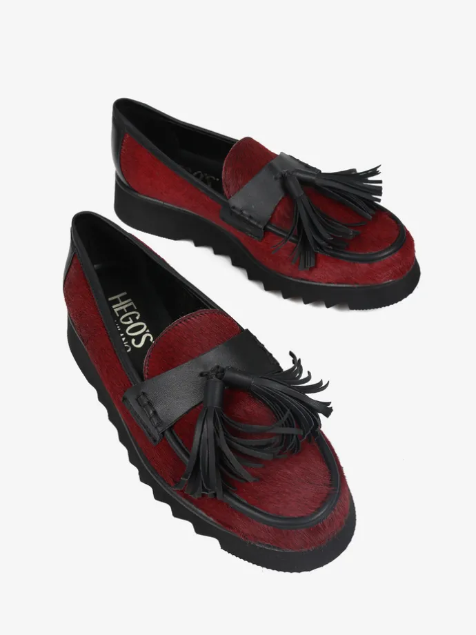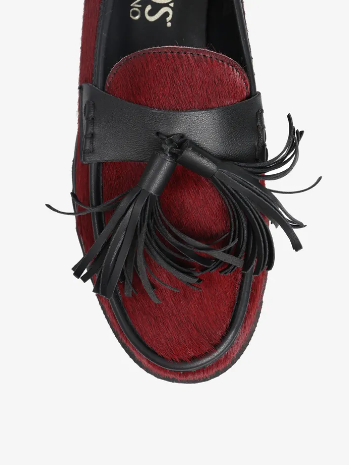 Bordowe mokasyny na efektownej podeszwie wykonane z naturalnej skóry z włosiem. Ozdobna patka z frędzlami.