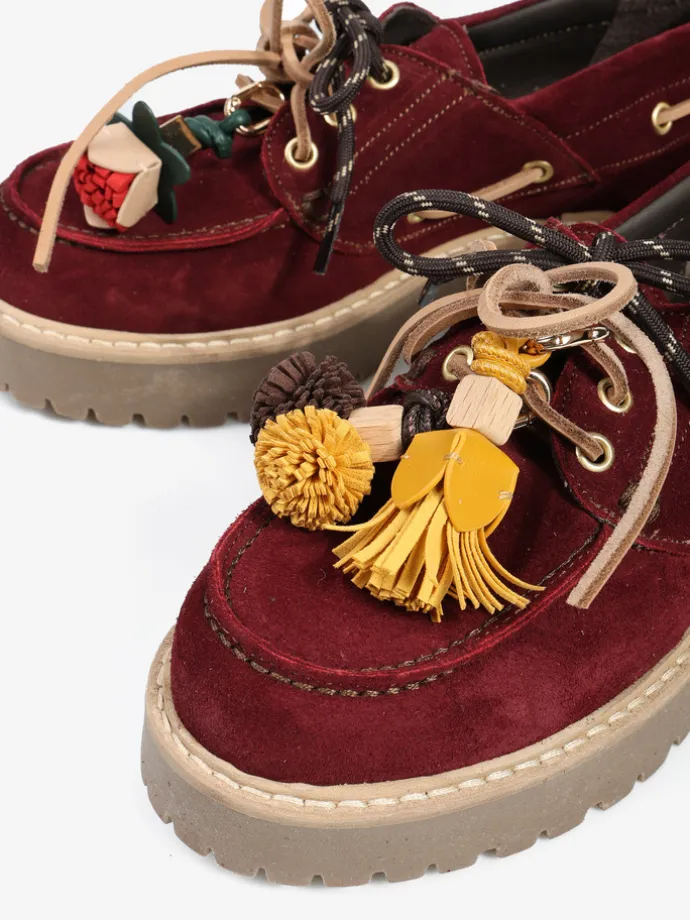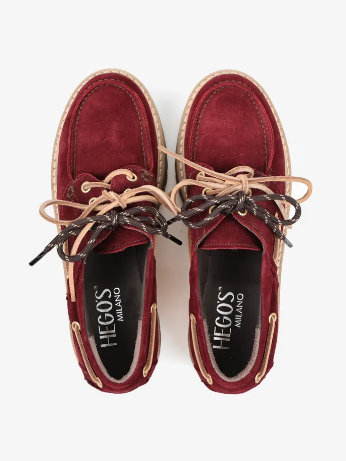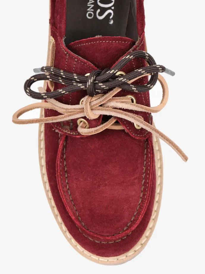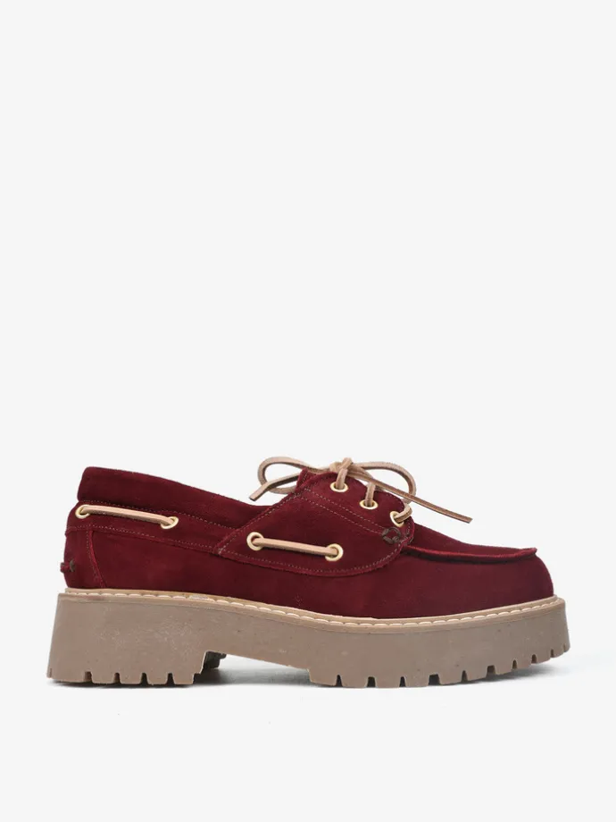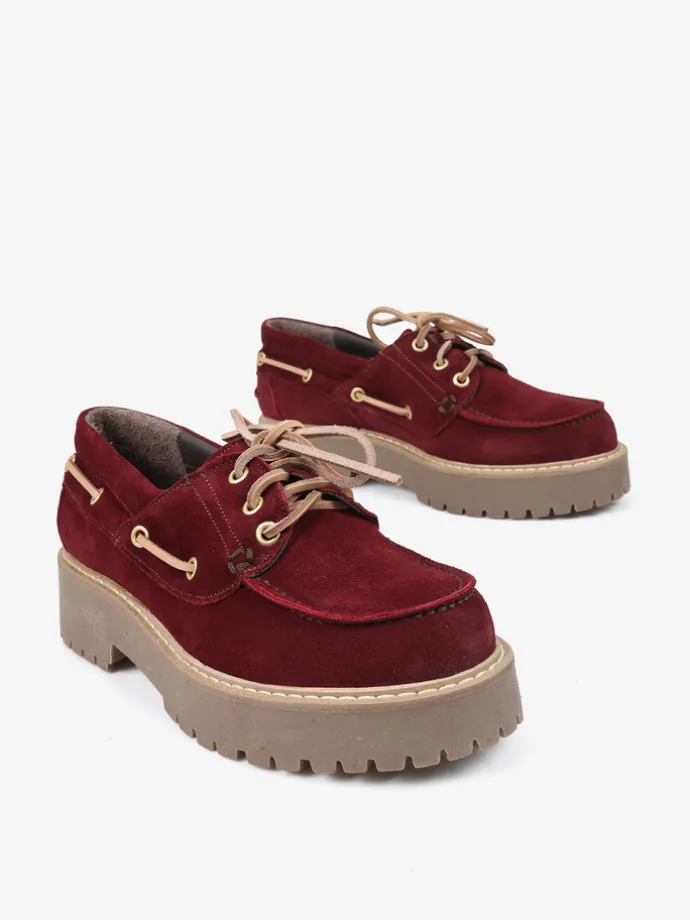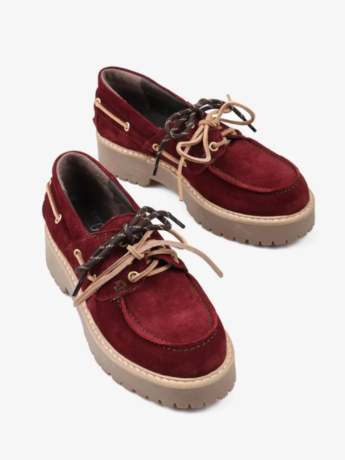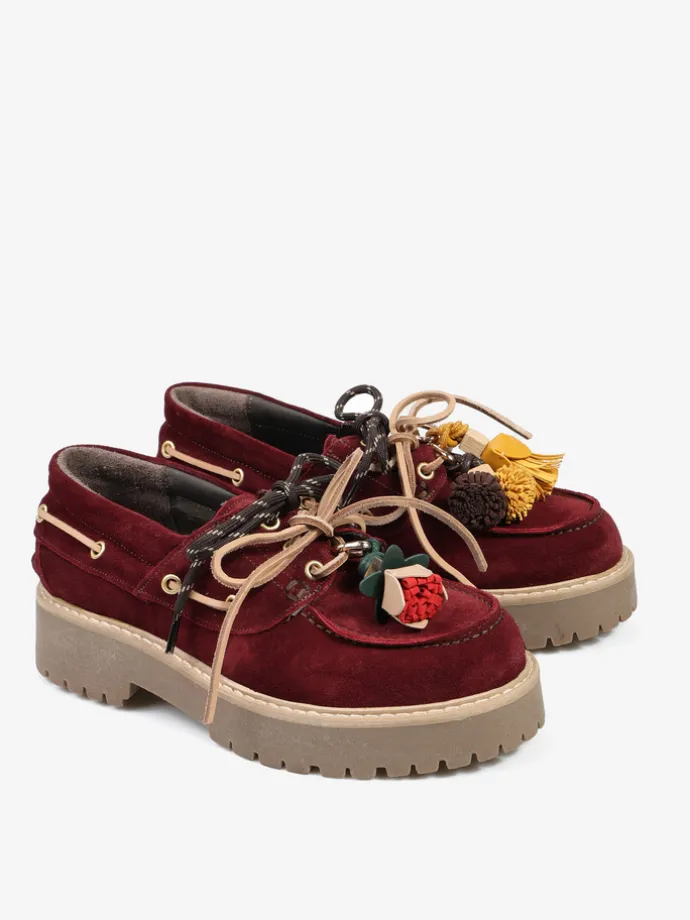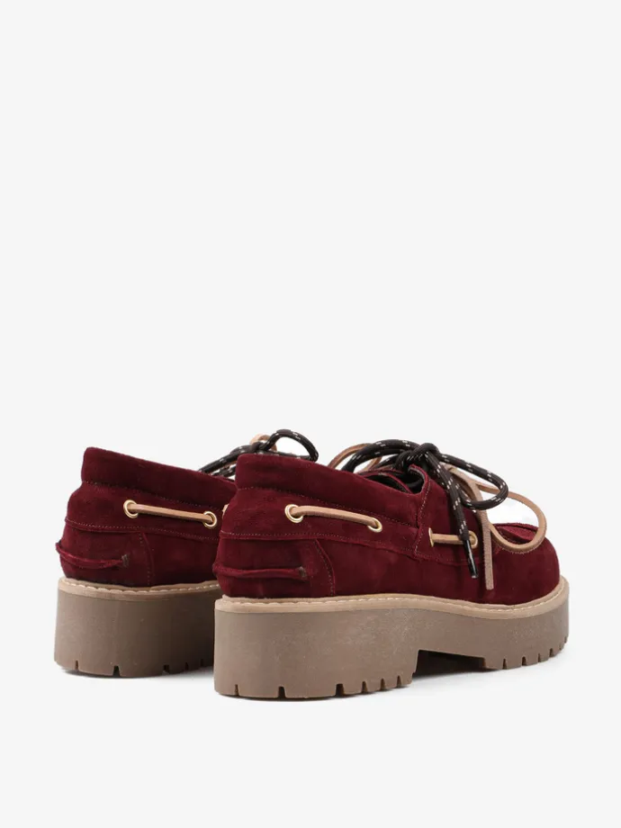 Bordowe, zamszowe mokasyny na platformie z wiązaniem na rzemyk. W komplecie dodatkowe sznurówki. Przywieszka dostępna oddzielnie.