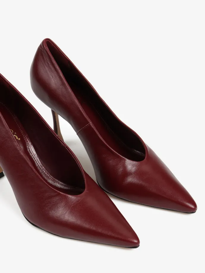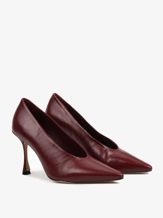 Szpilki na wysokim, delikatnie rozszerzanym obcasie. Owalne wycięcia z zabudowanymi brzegami i noski w szpic.
