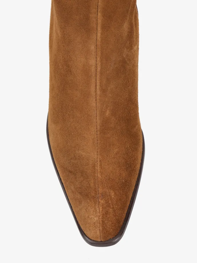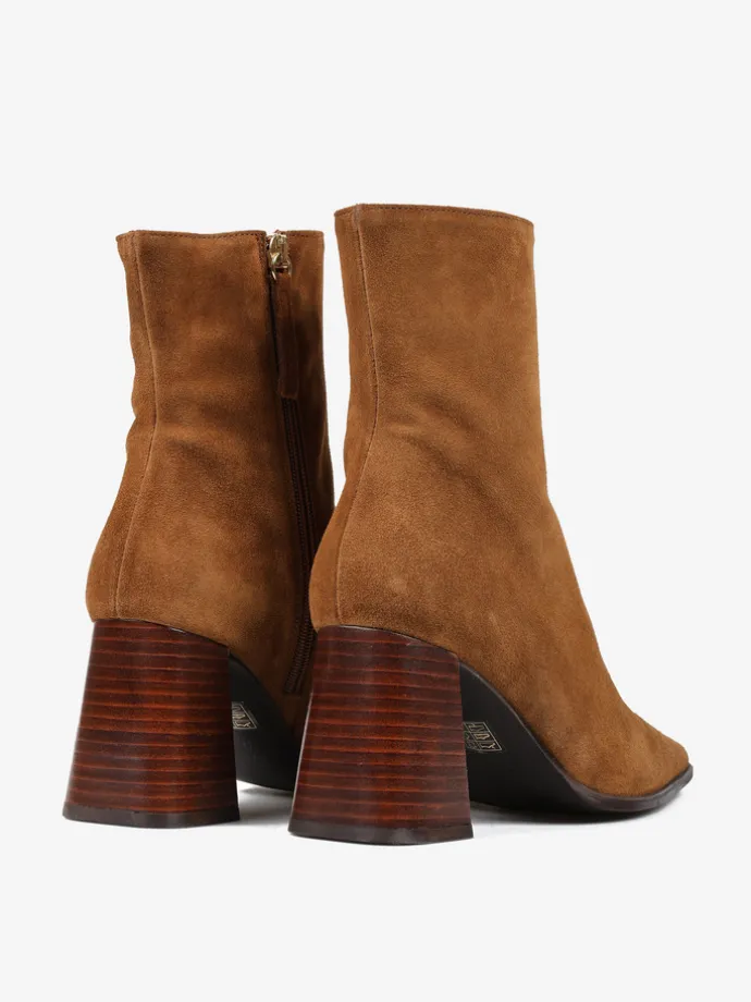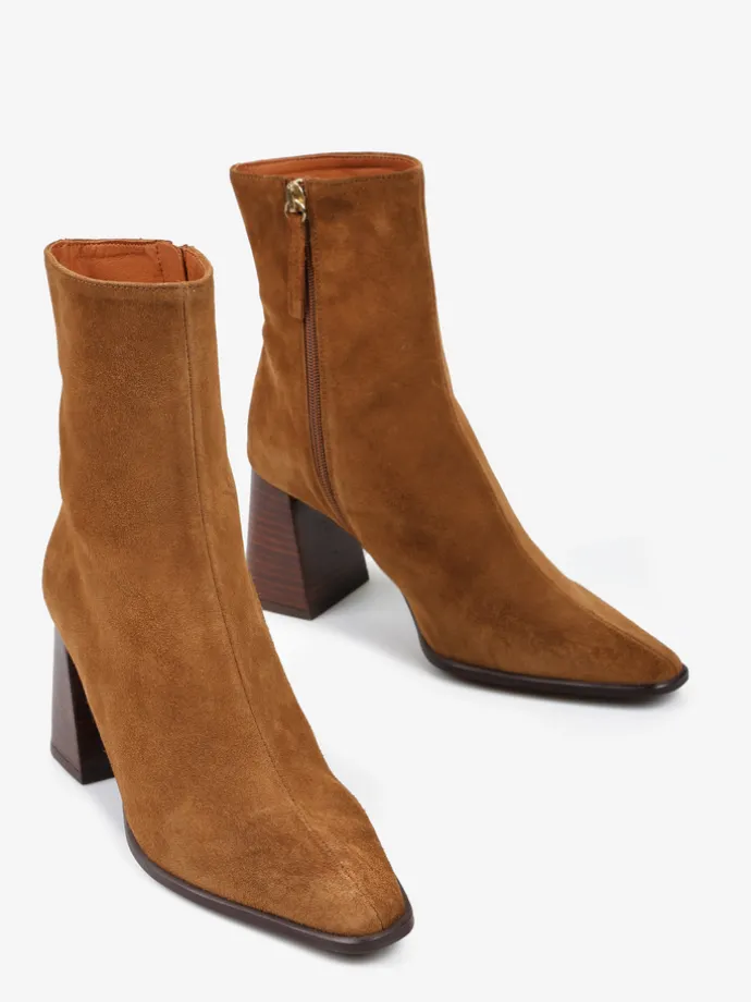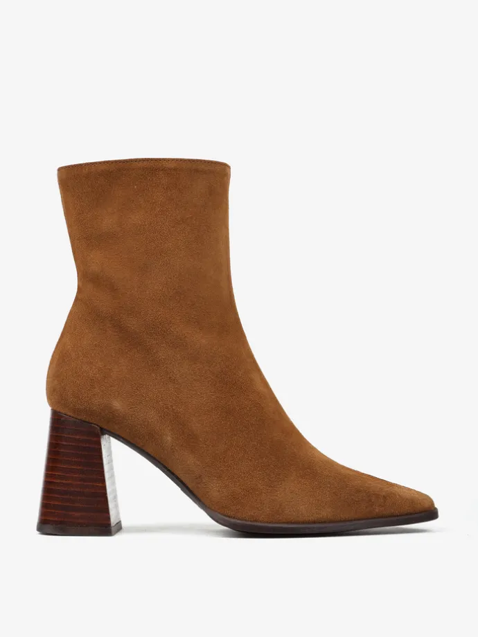 Zamszowe botki na rozszerzanym słupku. Wydłużone noski i zapięcie na suwak.