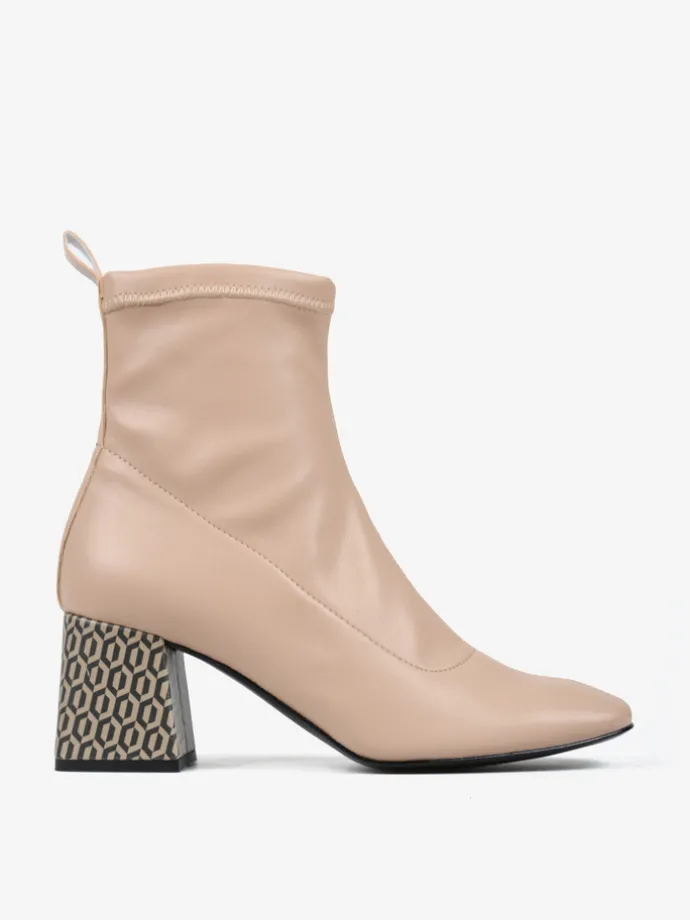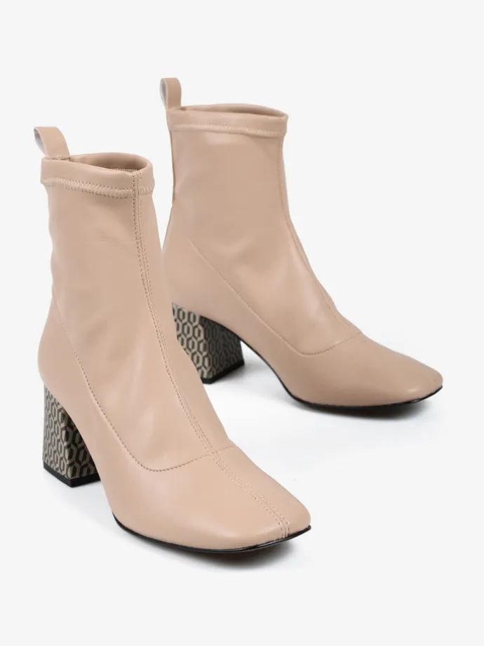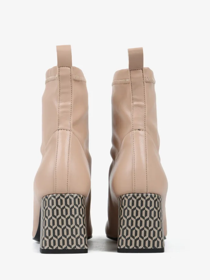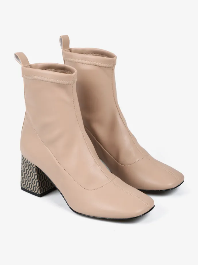 Wsuwane botki z kwadratowymi noskami. Efektowny słupek w geometryczny wzór.