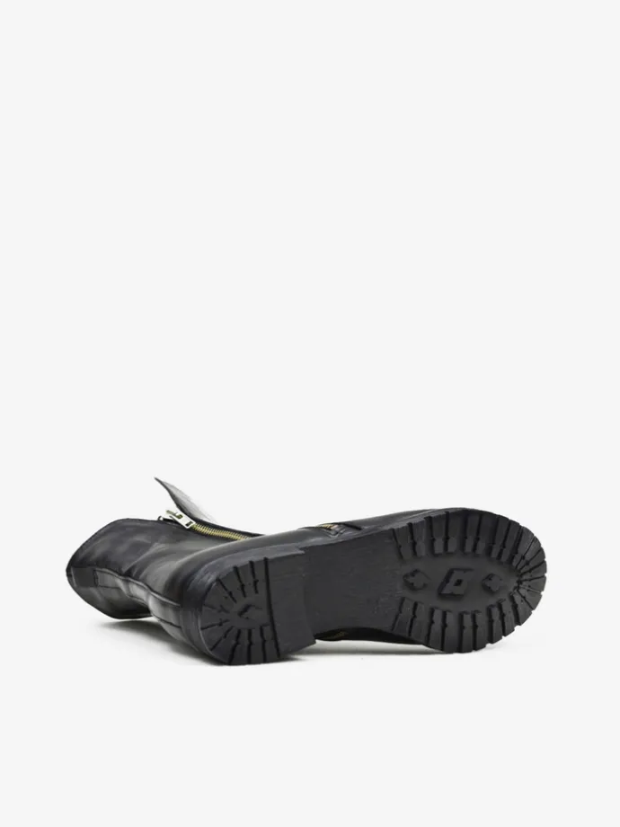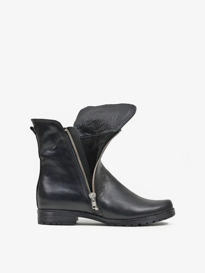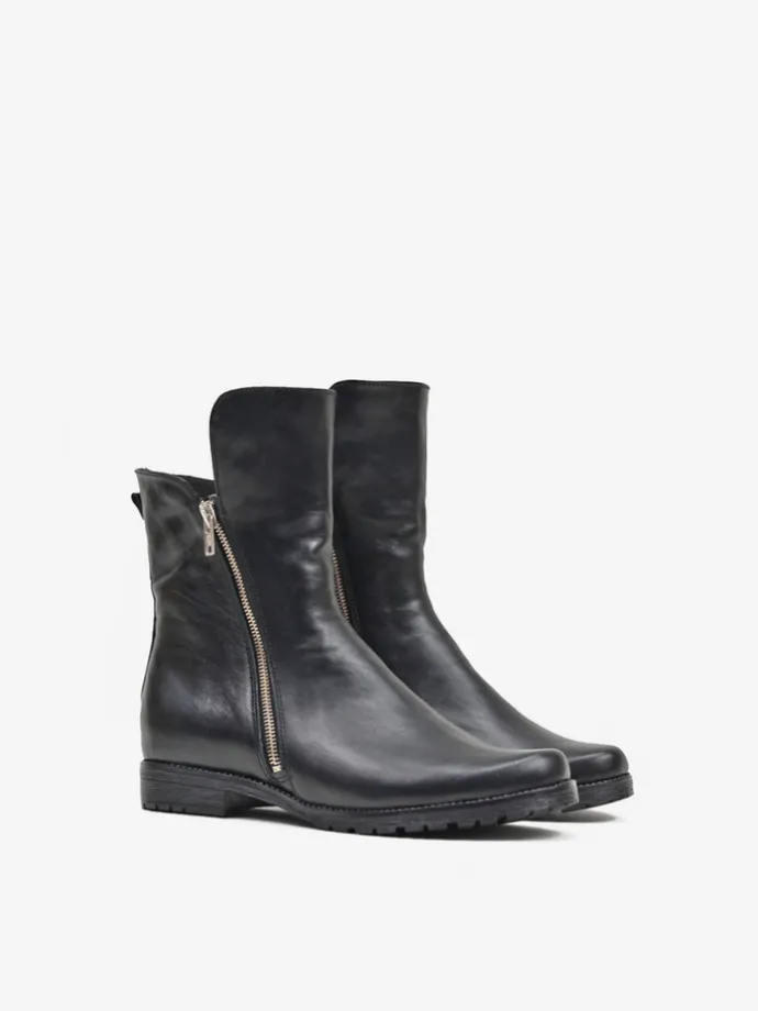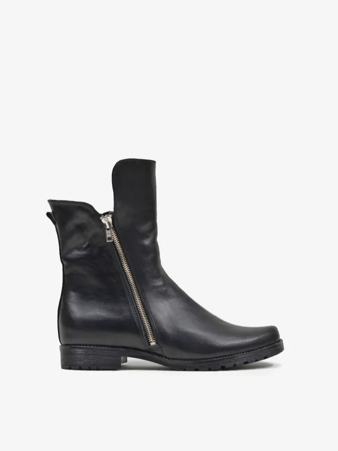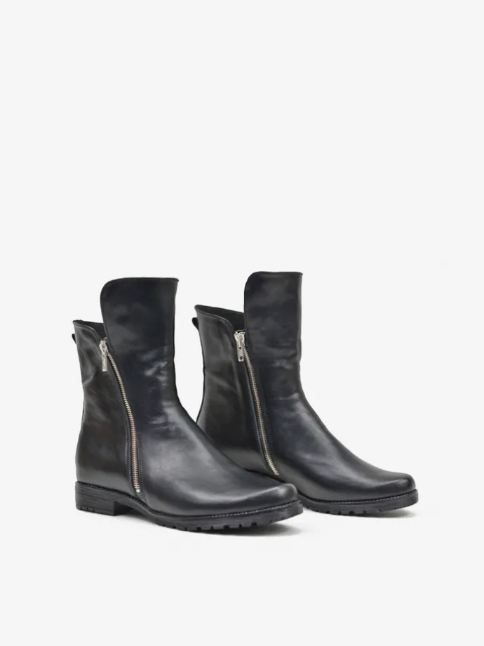 Czarne, ocieplane botki o niecodziennym kroju. Zasuwane na dwa widoczne, srebrne suwaki. Mogą być noszone zasunięte lub lekko rozsunięte. Gruby bieżnik na podeszwie.
