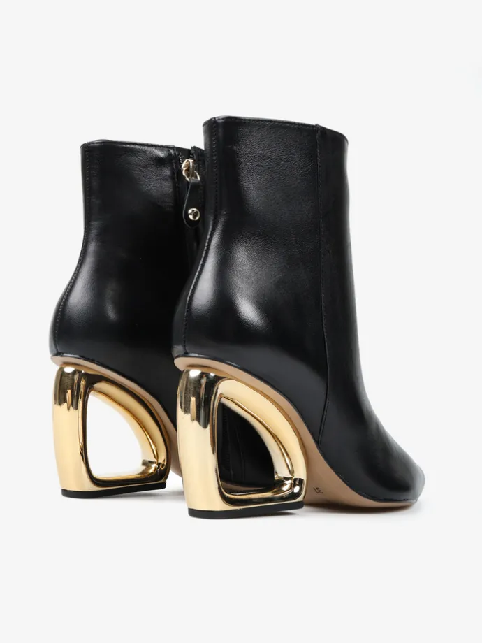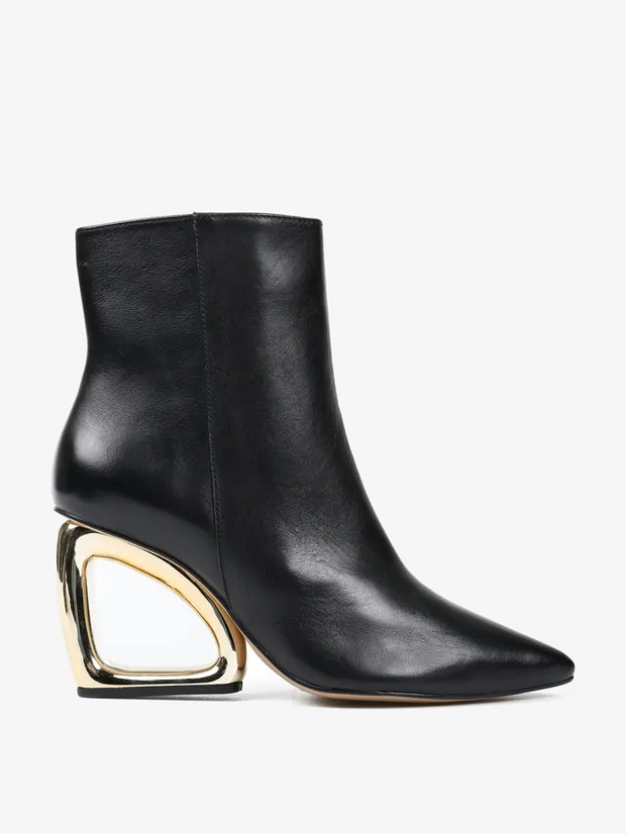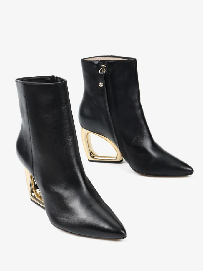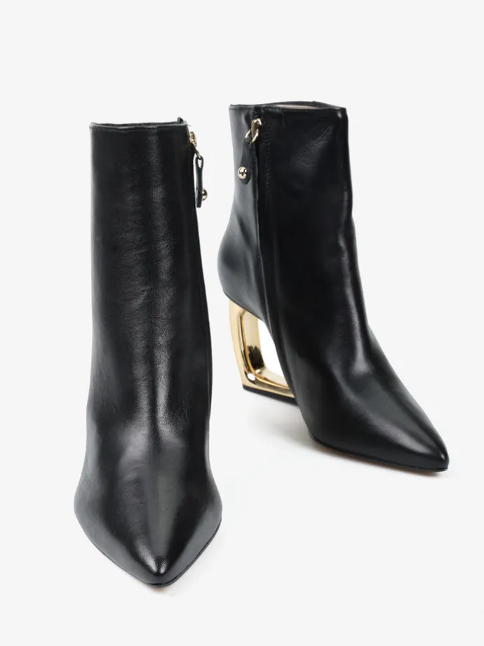 Eleganckie botki z zapięciem na zamek, wykonane z miękkiej i delikatnej skóry. Geometryczny, złoty obcas i nosek w szpic.