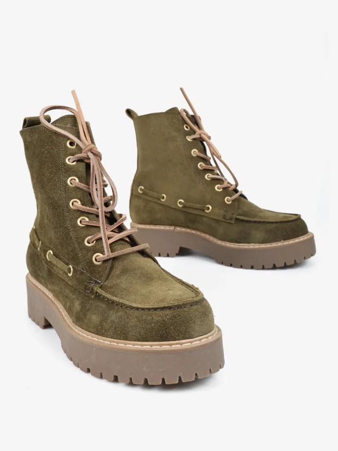 Botki na platformie w stylu boat shoe. Wykonane z zielonego zamszu i sznurowane na rzemyk.