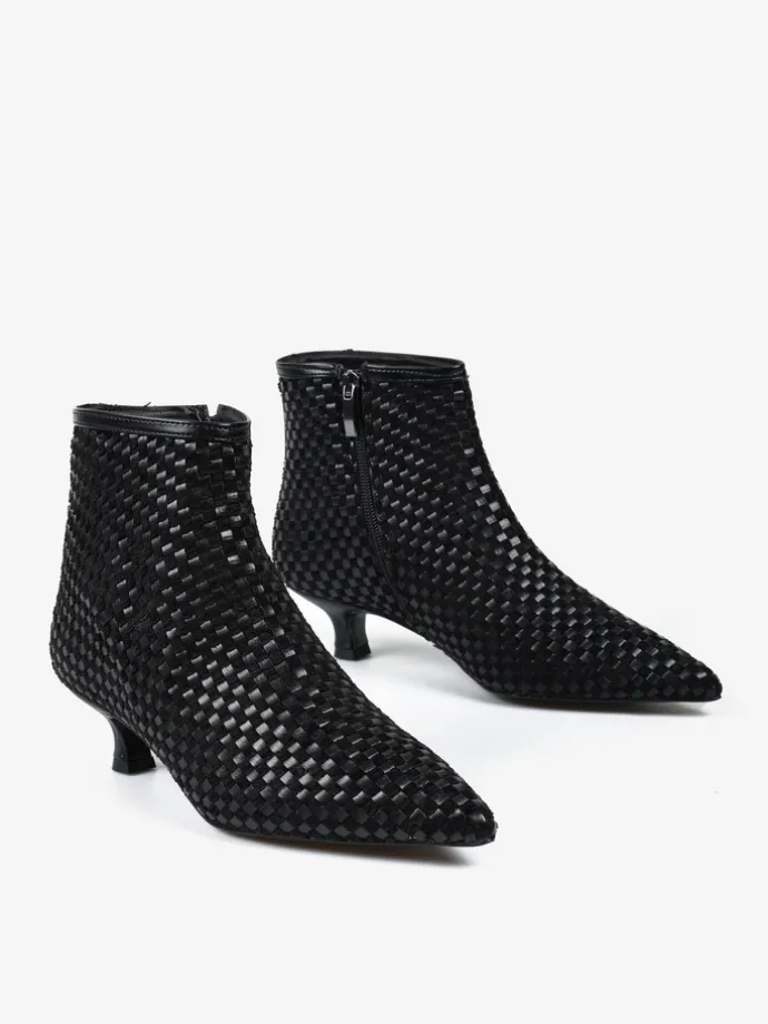 Botki na niskiej szpilce wykonane z plecionego materiału. Nosek w szpic i zapięcie na suwak.