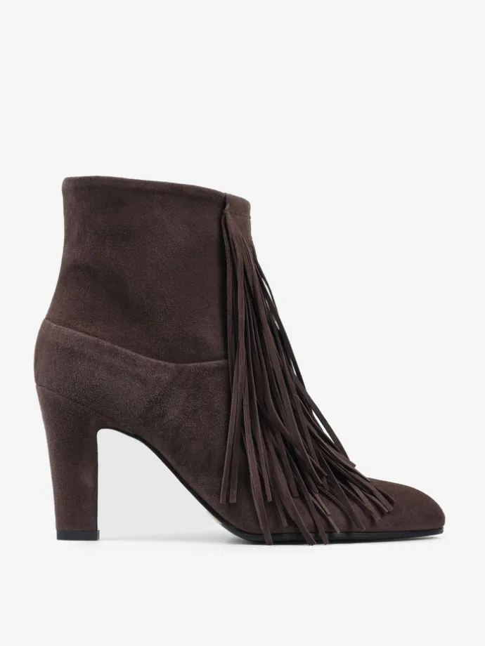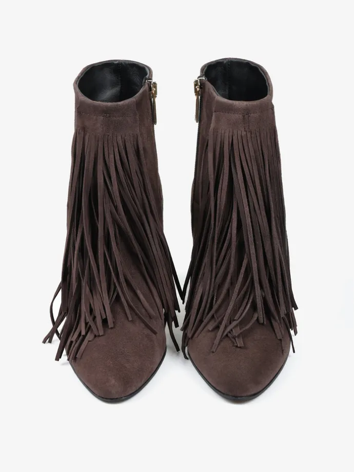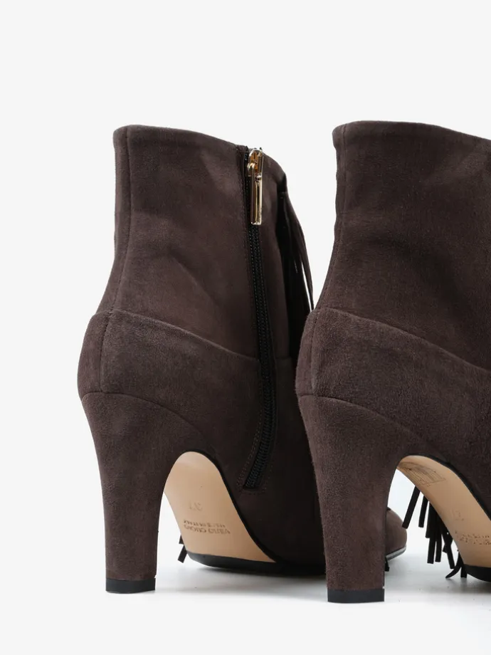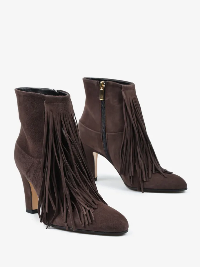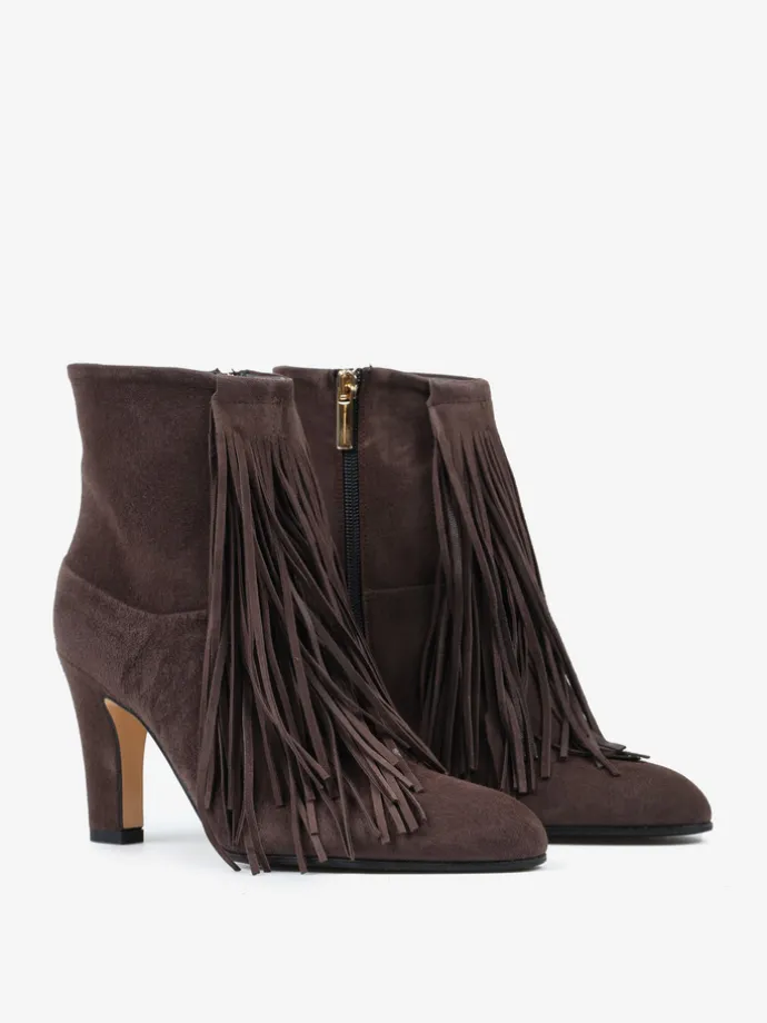 Zamszowe botki na słupku z ozdobnymi frędzlami i zapięciem na suwak.