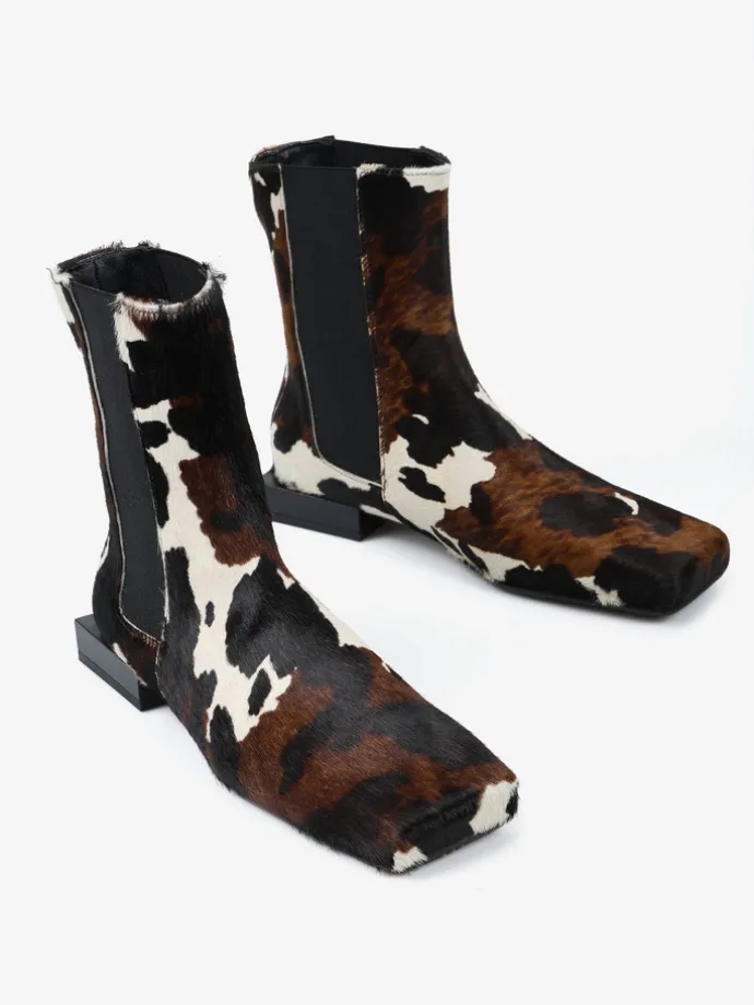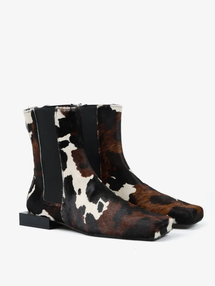 Wsuwane botki RAS na niskim klocku, wykonane ze skóry z włosiem w zwierzęcy wzór. Kwadratowe noski.