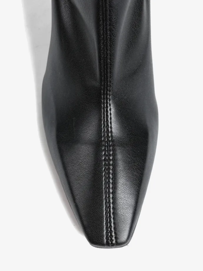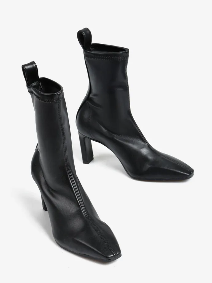 Czarne botki na szpilce wykonane z elastycznej, dopasowującej się do stopy skóry ekologicznej. Noski w szpic.
