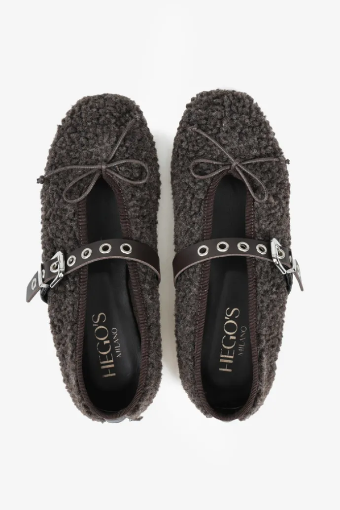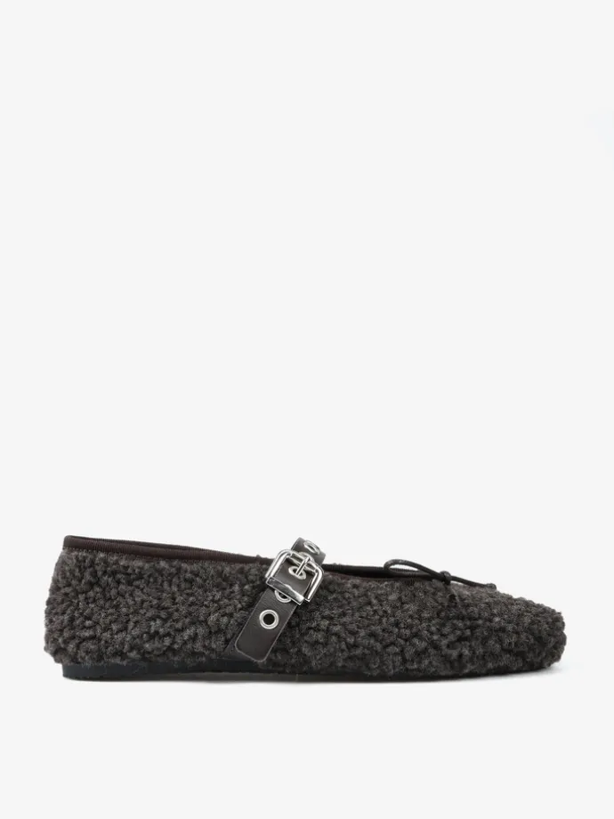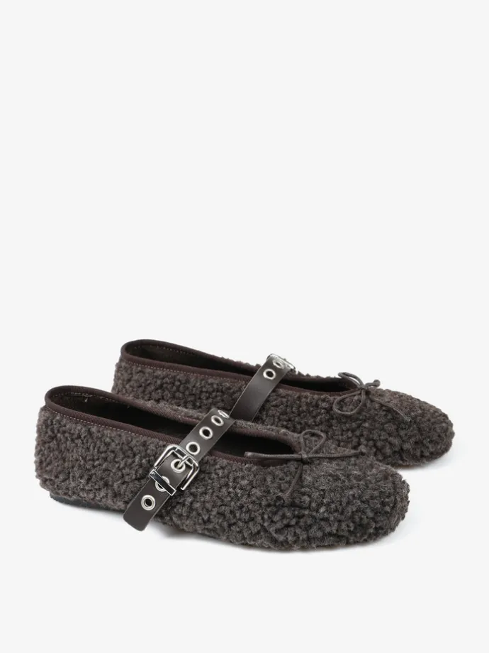 Baleriny z tkaniny imitującej futro baranka. Wiązana kokardka i regulowany pasek umożliwiają idealne dopasowanie.