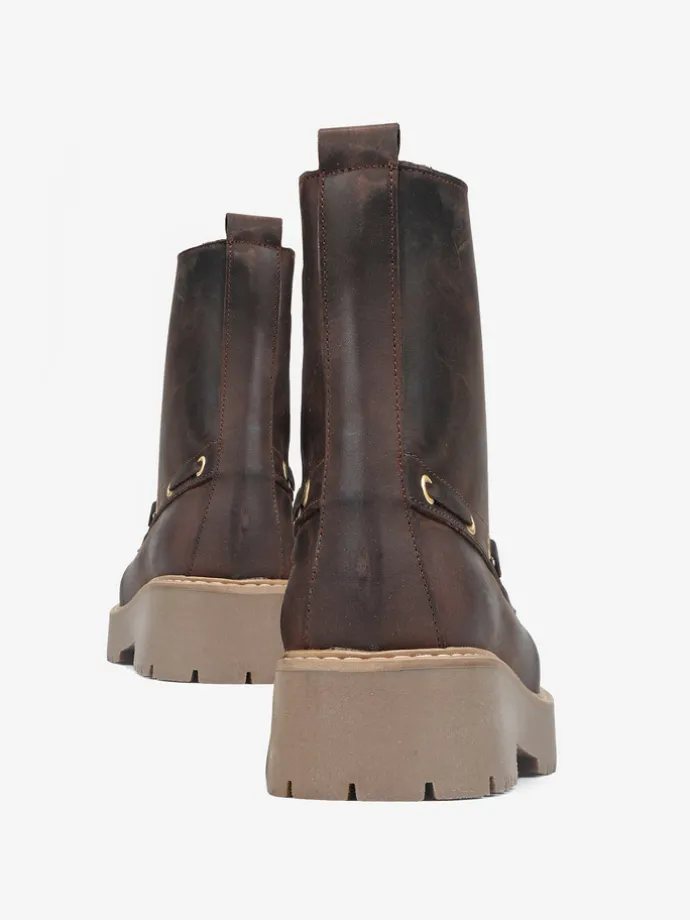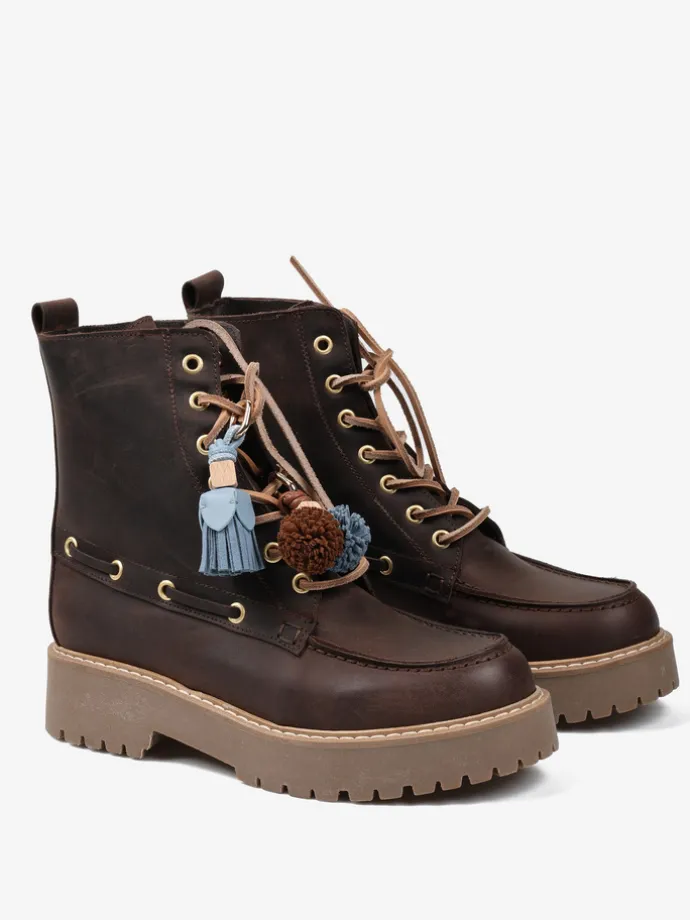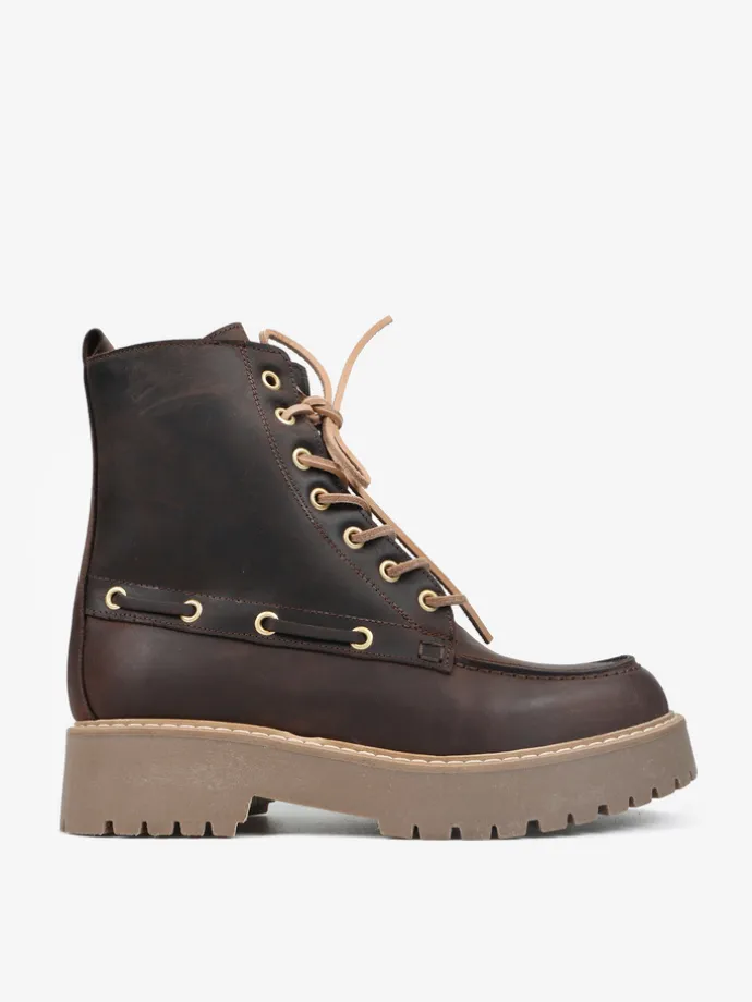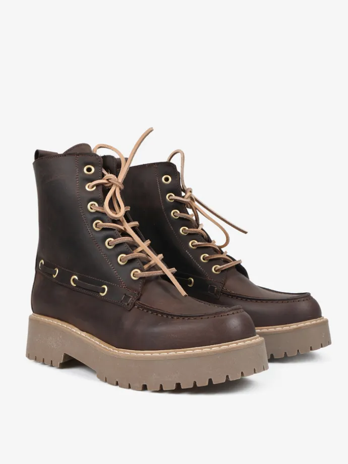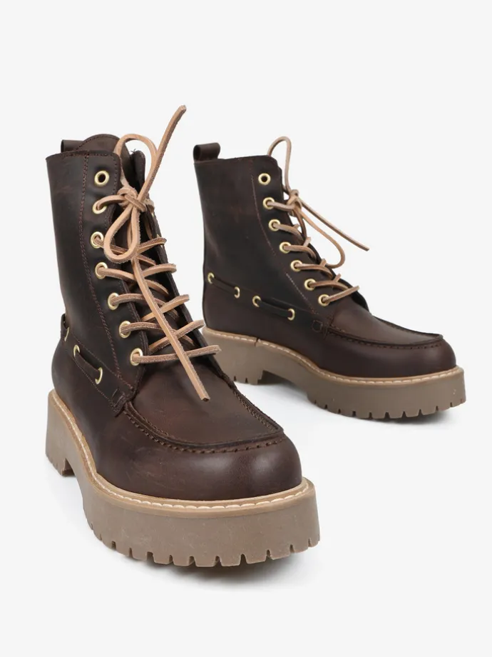 Botki na platformie w stylu boat shoe. Wykonane z brązowego nubuku i sznurowane na rzemyk.
