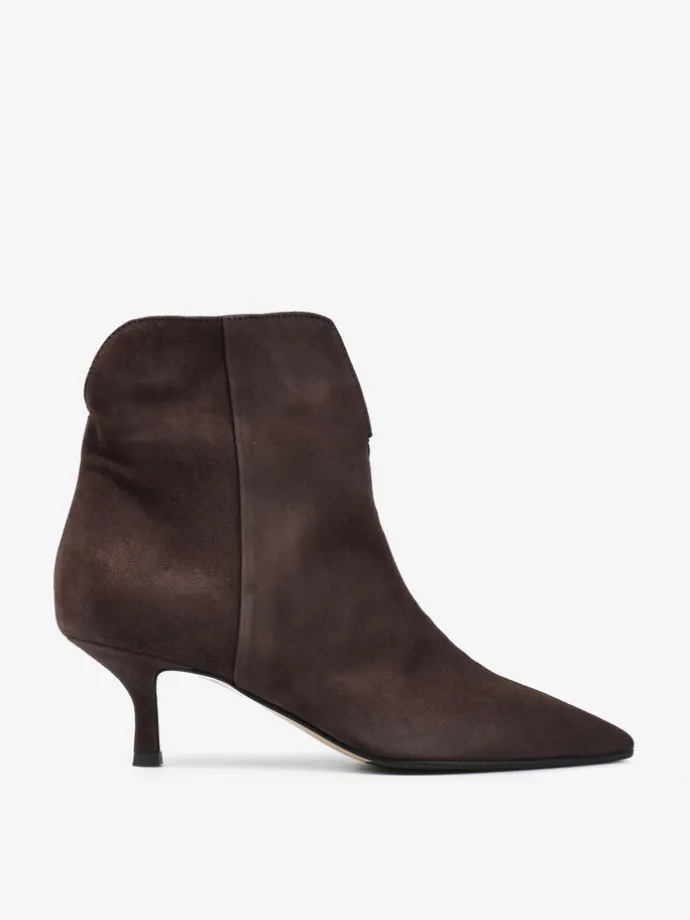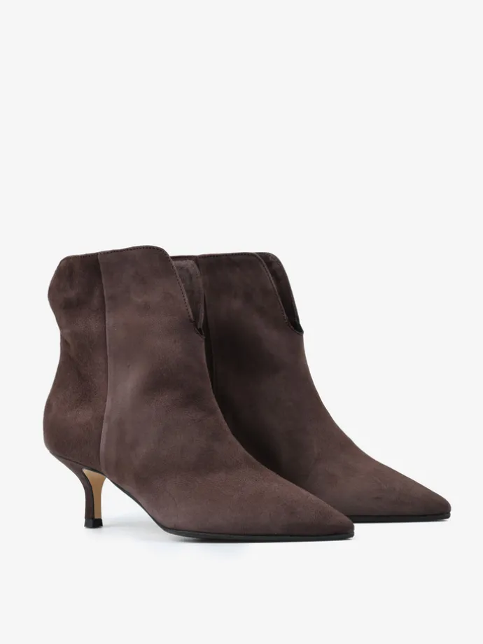 Botki na niskim obcasie to minimalistyczny model dla eleganckich kobiet. Wsuwana cholewka wykonana jest z naturalnego zamszu. Model z noskiem w szpic oraz wygodnym obcasem na szpilce. Botki damskie będą uzupełnieniem nie tylko casualowych stylizacji.