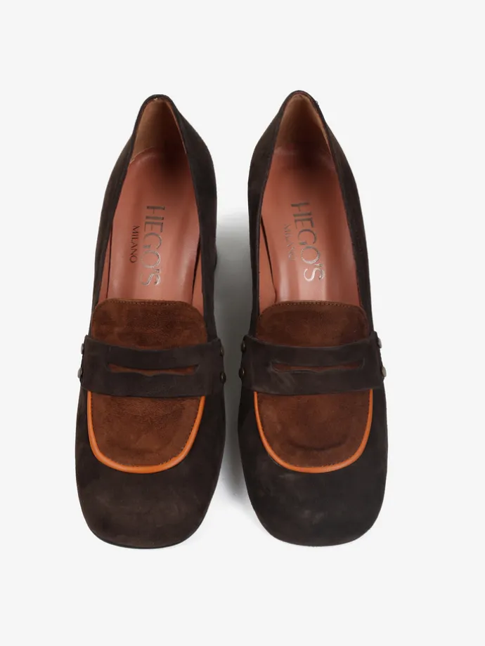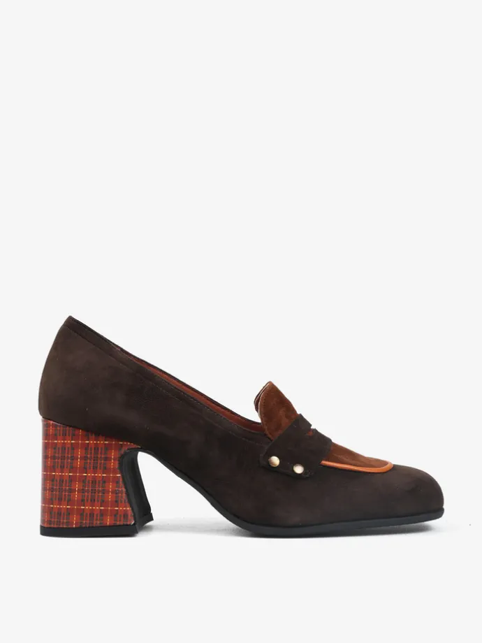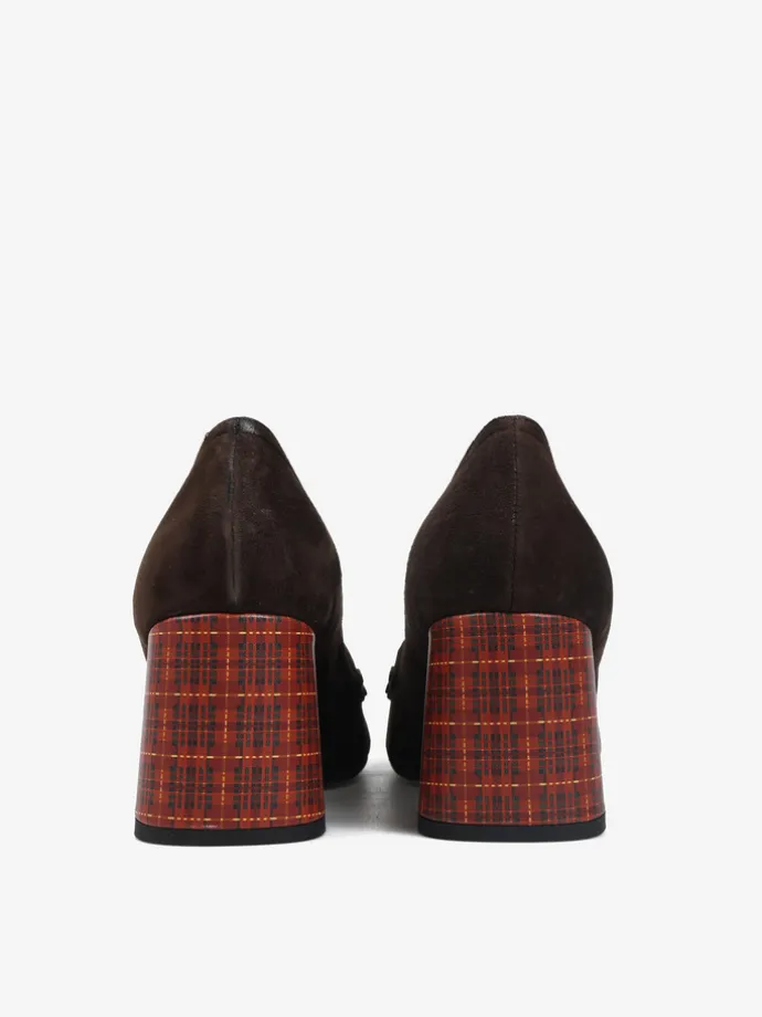 Zamszowe czółenka na słupku ze wzorem w kratkę. Kwadratowe noski, ozdobna patka z ćwiekami i kontrastująca, pomarańczowa lamówka.