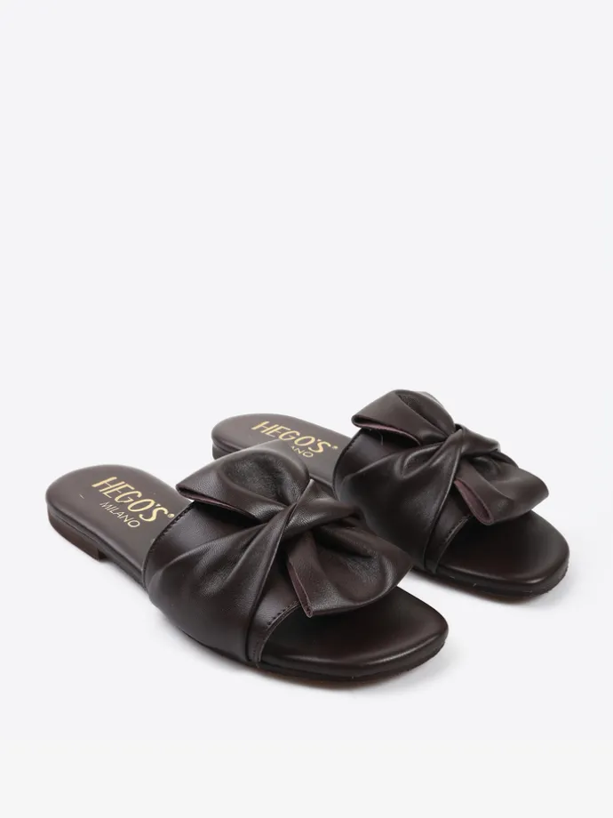 Klapki z ozdobnym wiązaniem wykonane z miękkiej, delikatnej skóry.