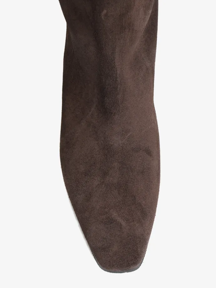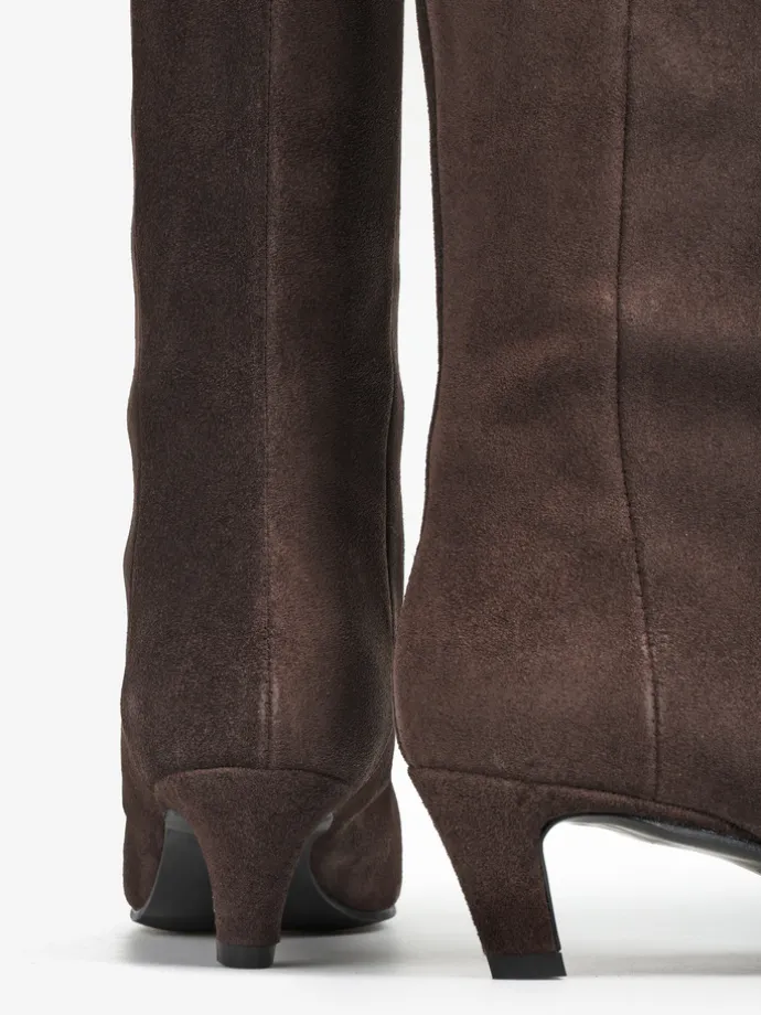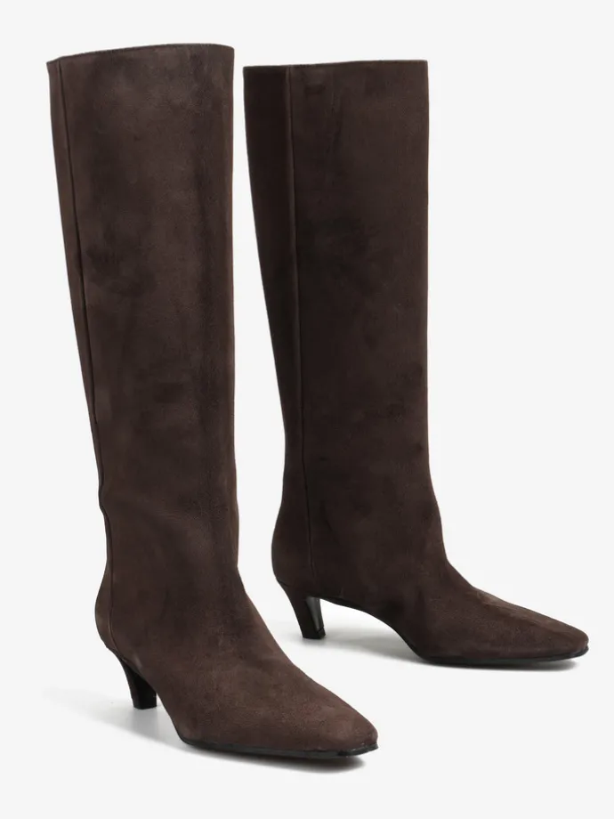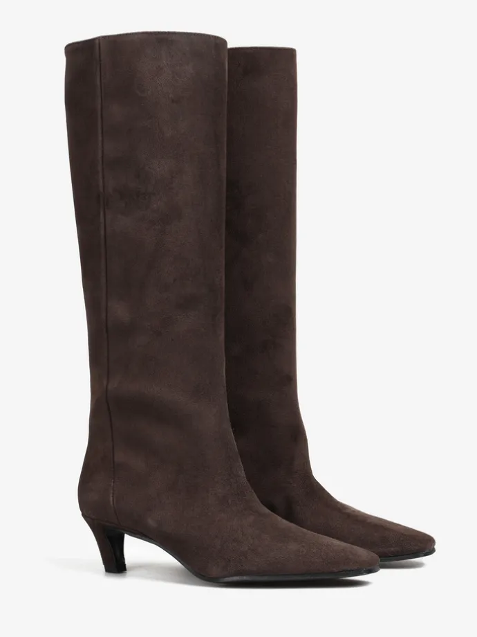 Wsuwane kozaki na niskiej szpilce z wydłużonymi, kwadratowymi noskami.