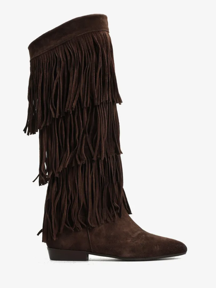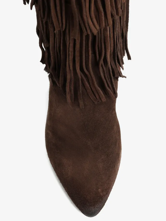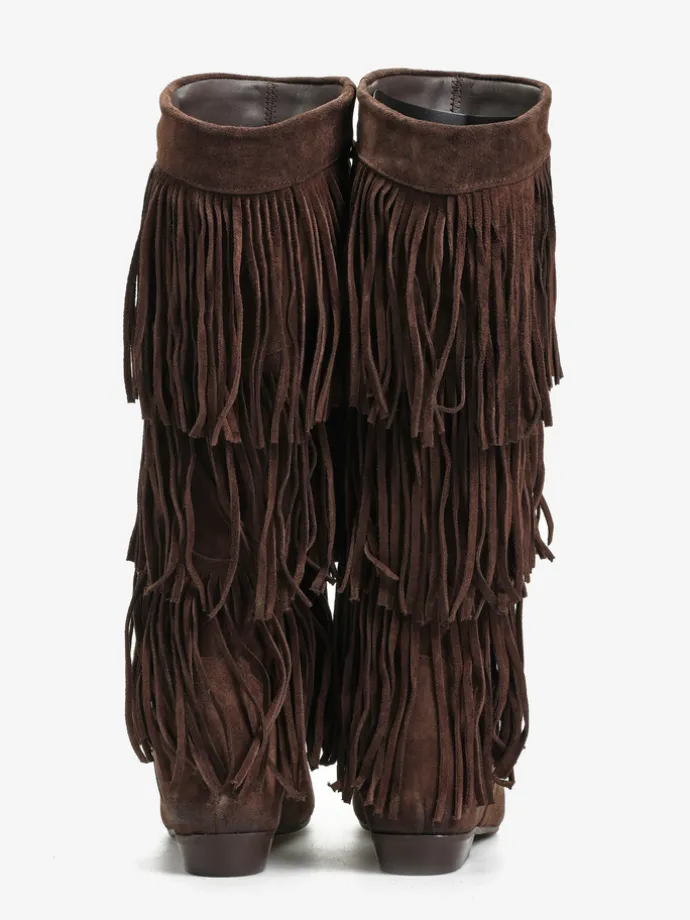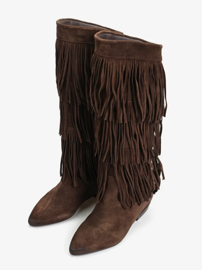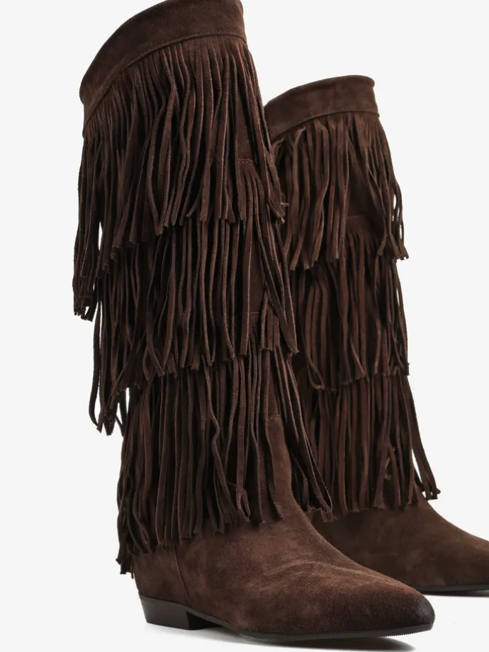 Zamszowe, wsuwane kozaki z ukrytym koturnem (ok. 5 cm). Noski w szpic i ozdobne frędzle.