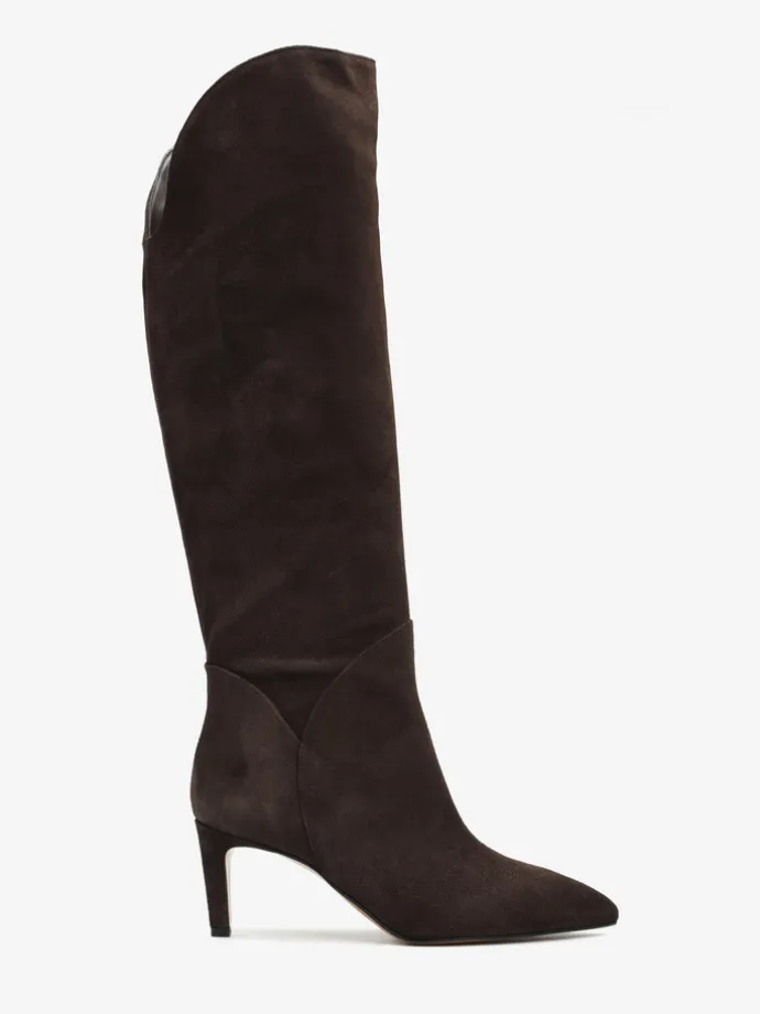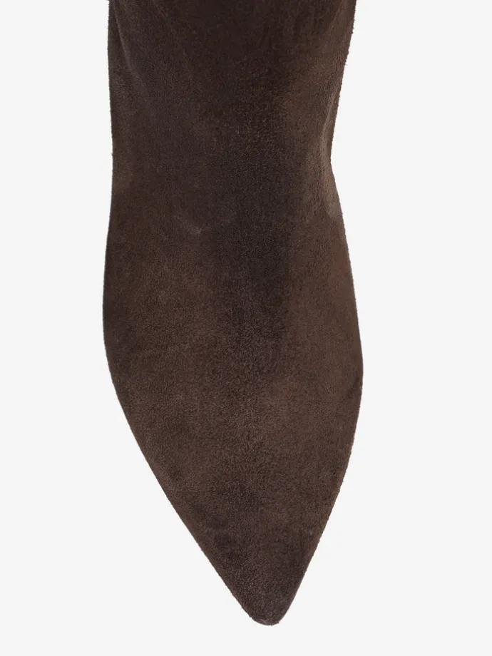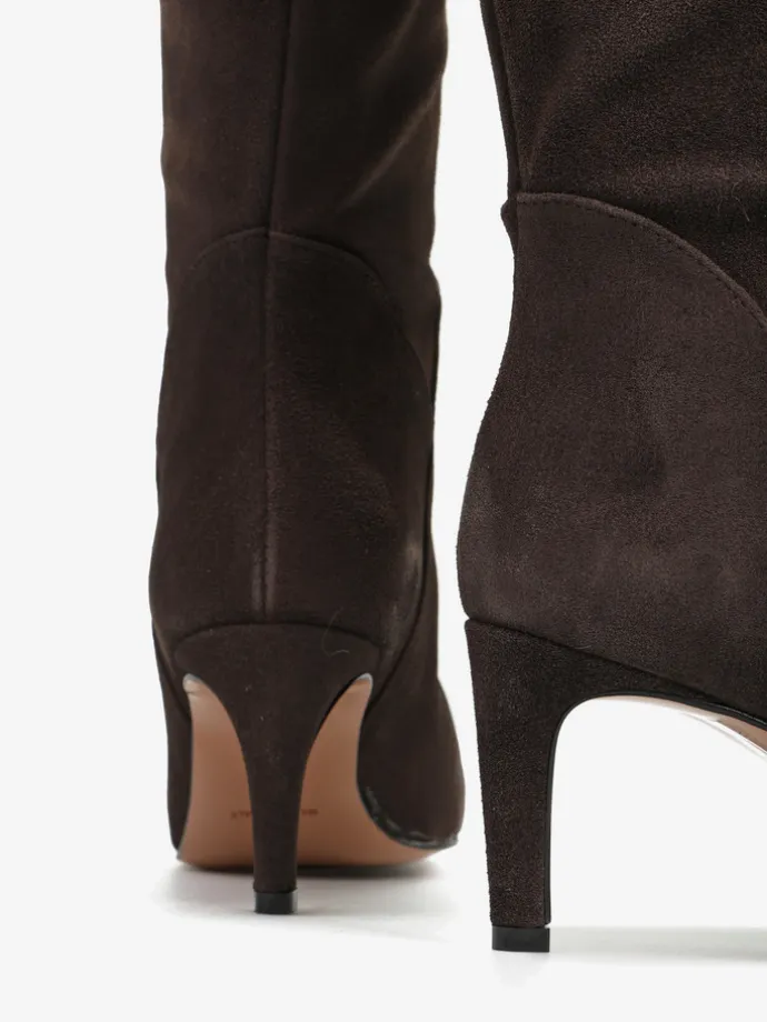 Zamszowe, wsuwane kozaki na szpilce w stylu muszkieterek. Noski w szpic i asymetryczna cholewka z ozdobnymi przeszyciami.