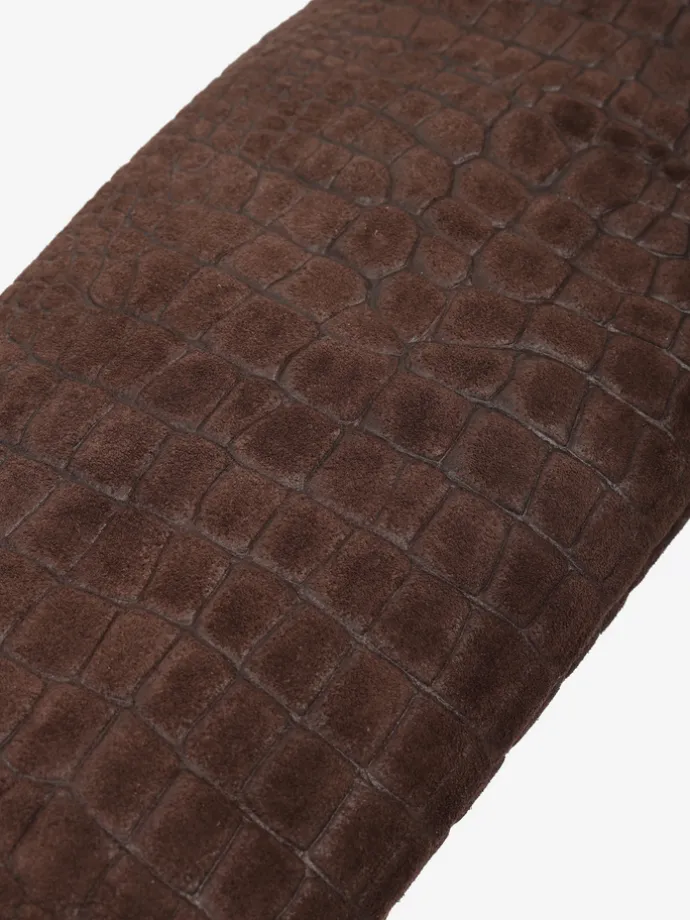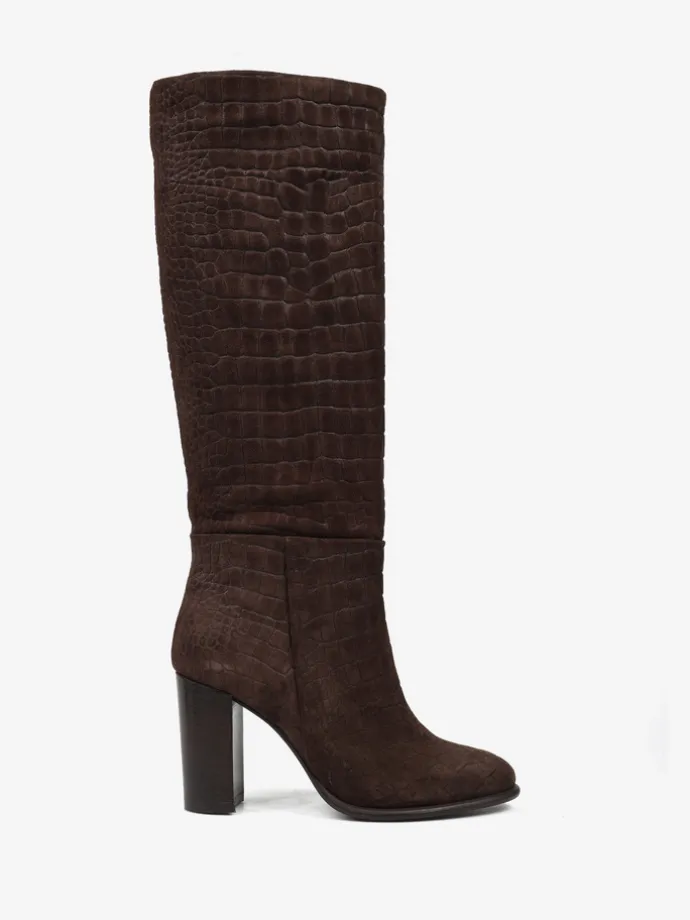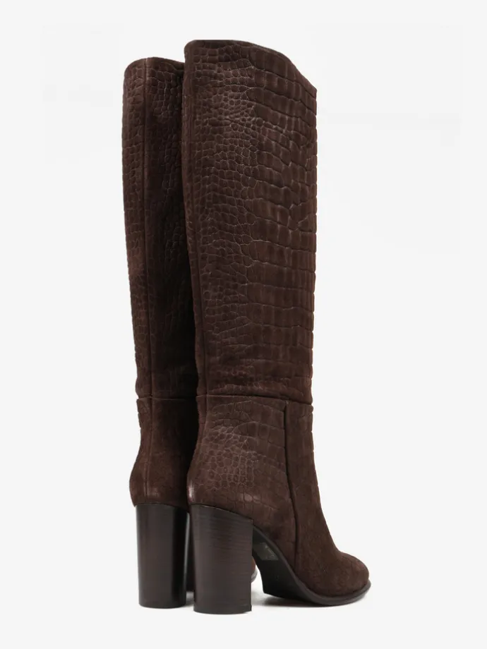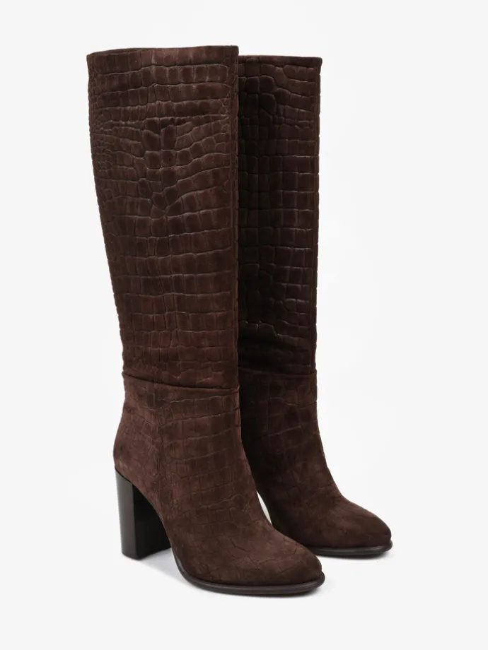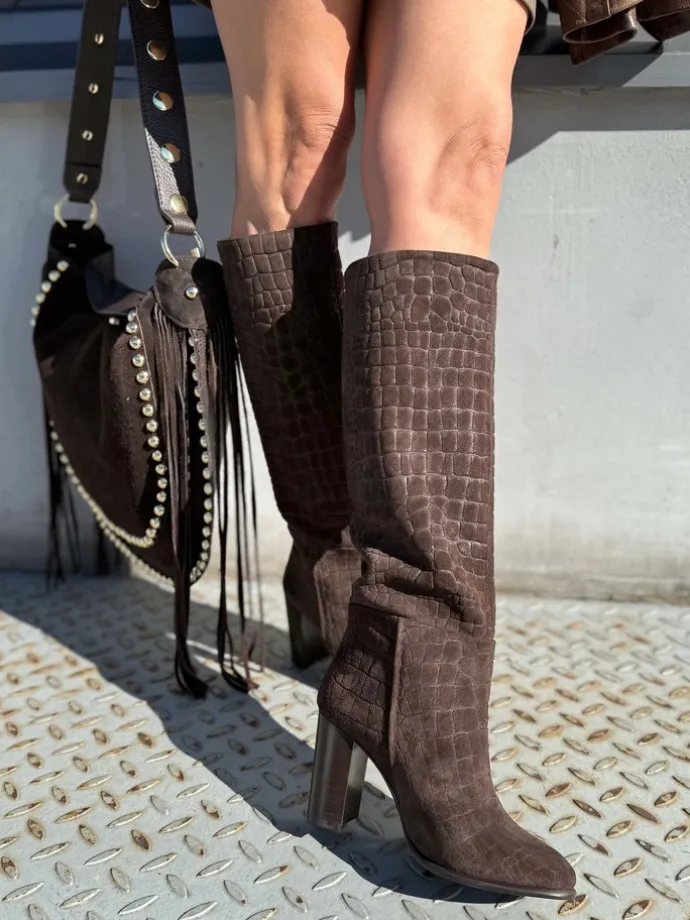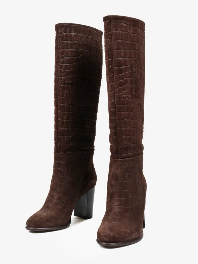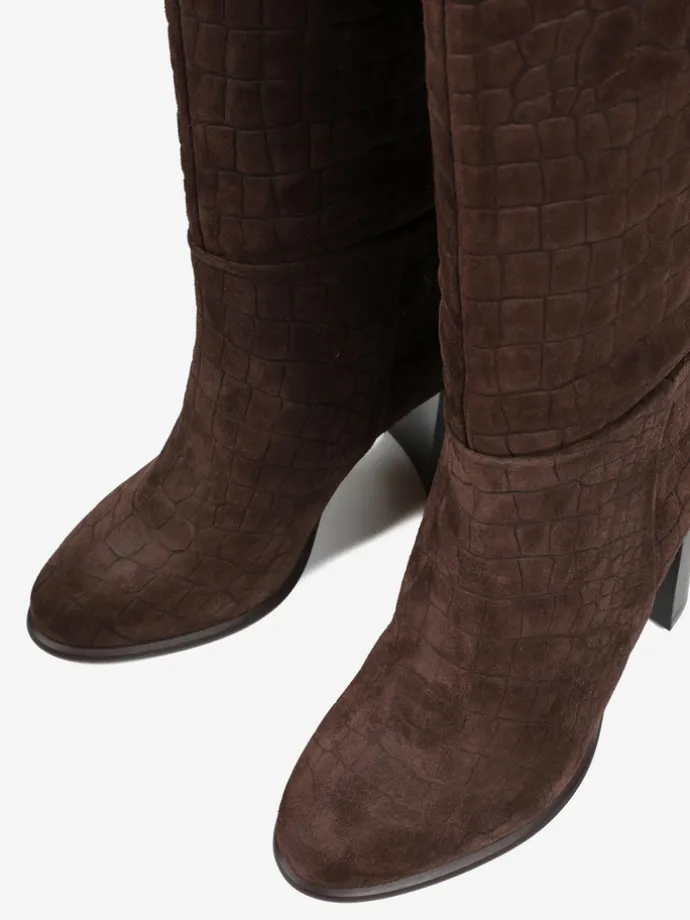 Wsuwane kozaki na słupku wykonane z zamszu tłoczonego w krokodyli wzór.