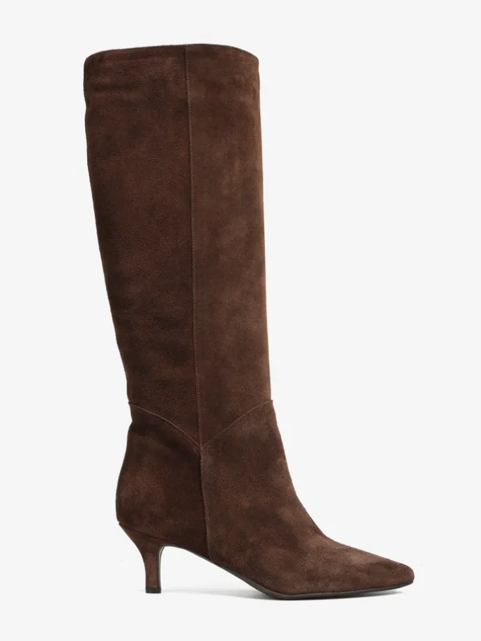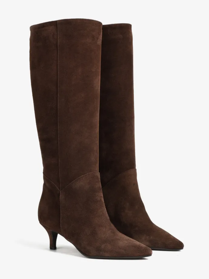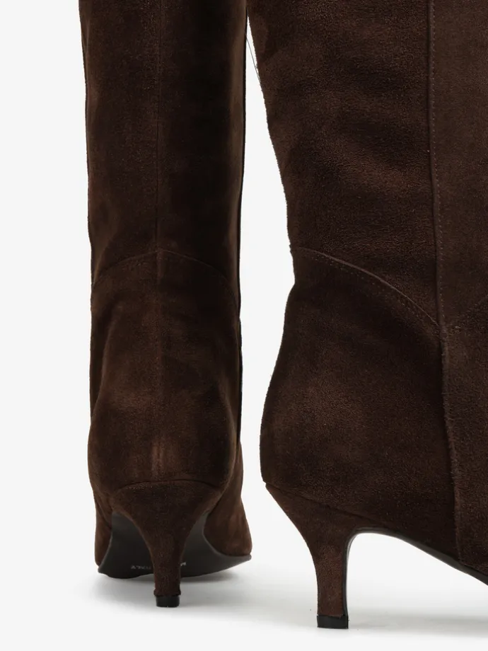 Zamszowe kozaki na niskiej szpilce. Noski w szpic i cholewka z ozdobnymi przeszyciami.