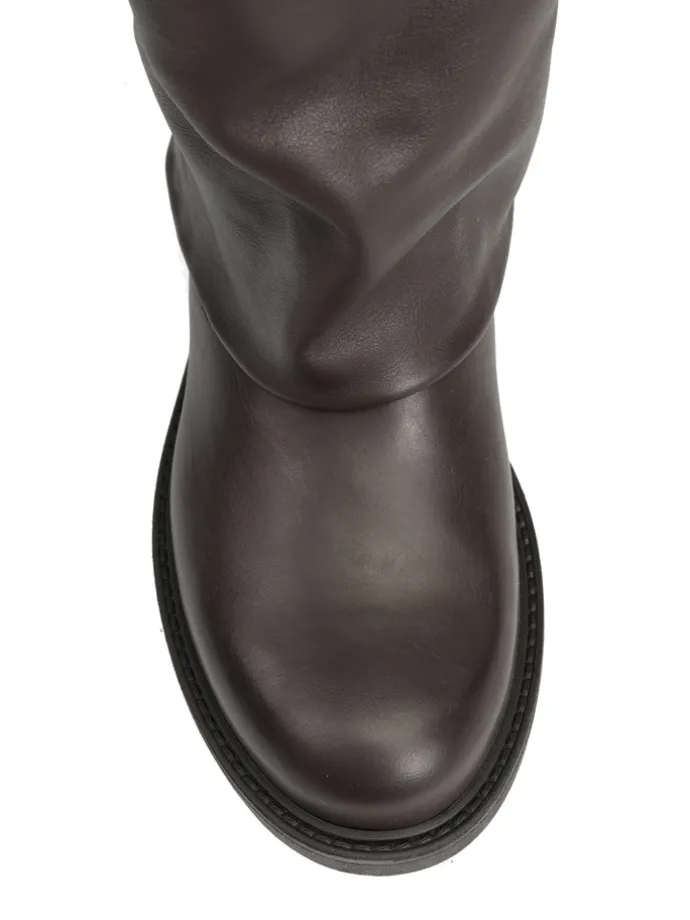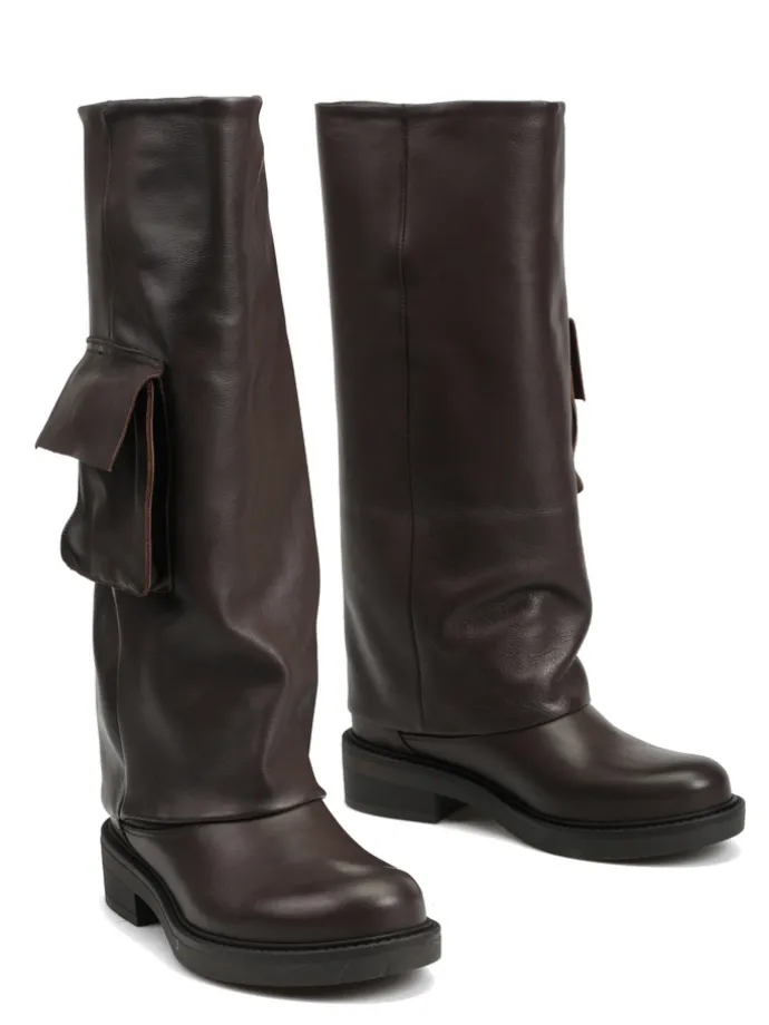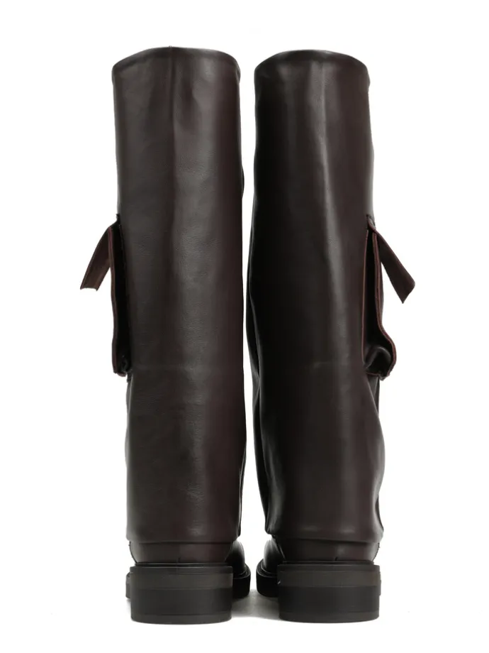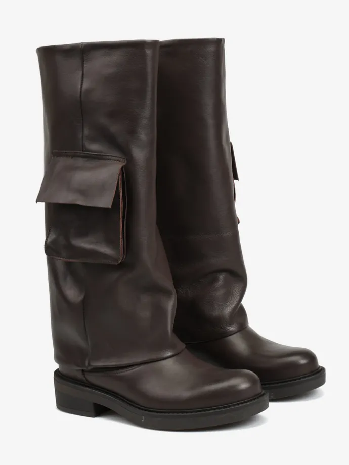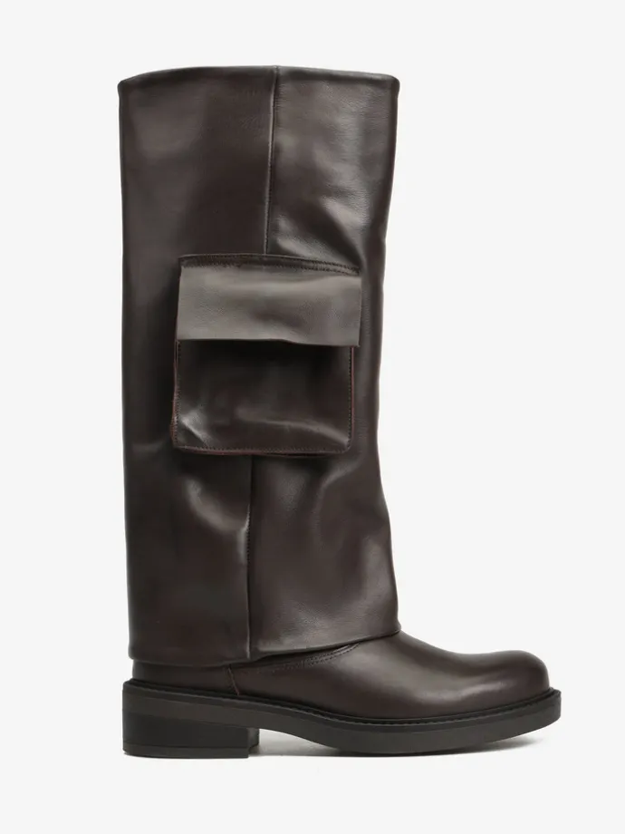 Wsuwane kozaki z szeroką cholewą i ozdobną kieszonką.