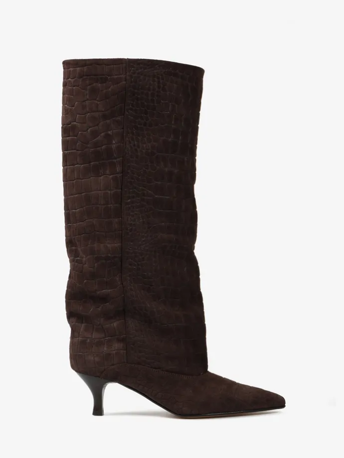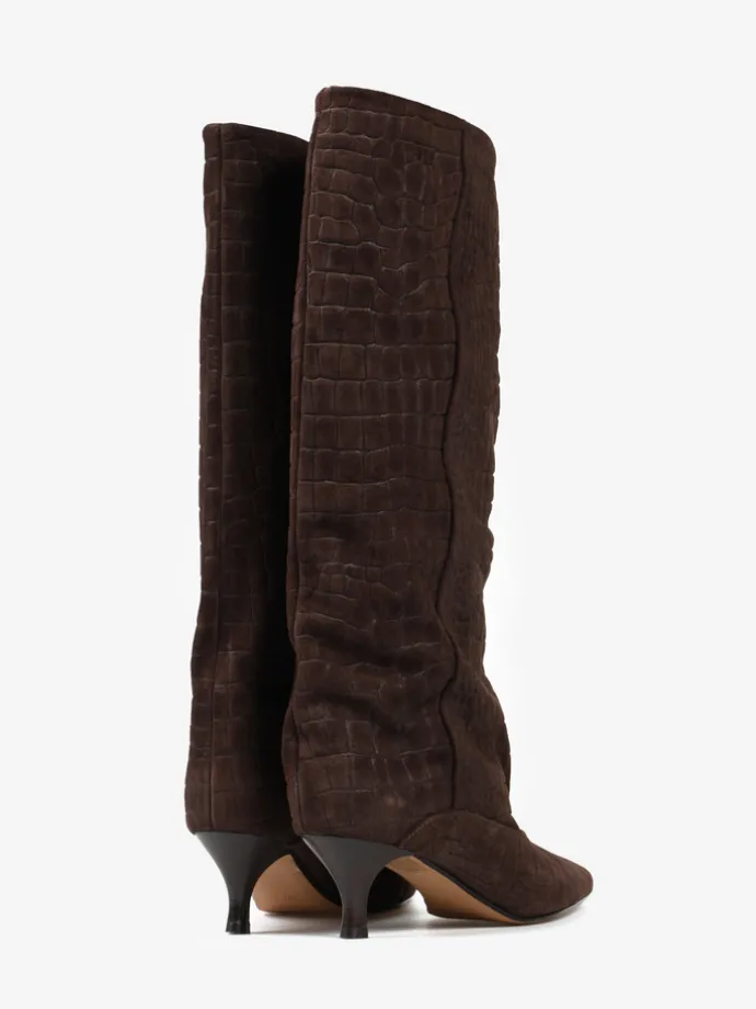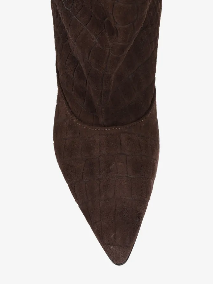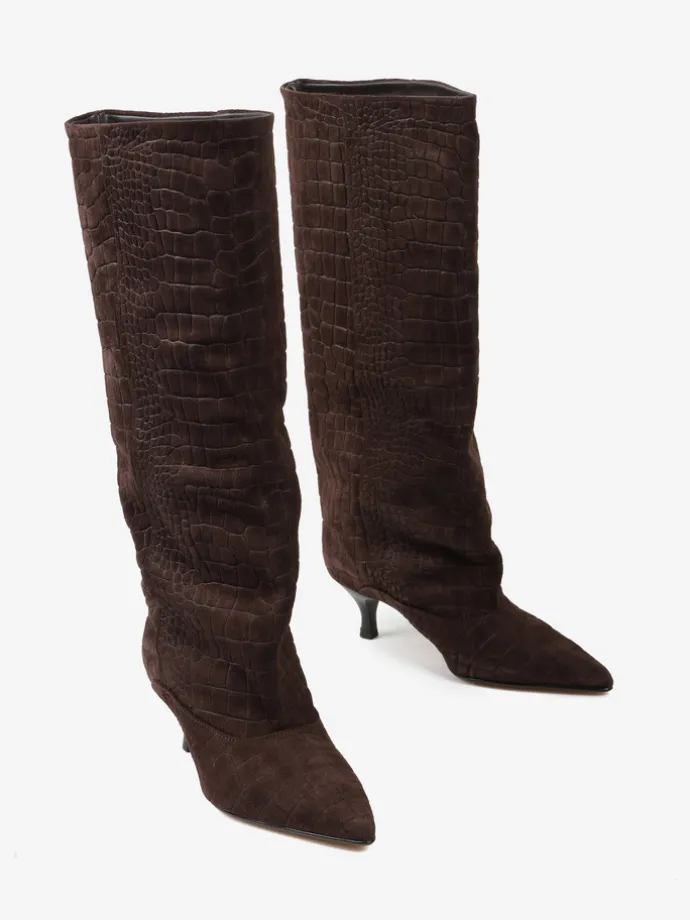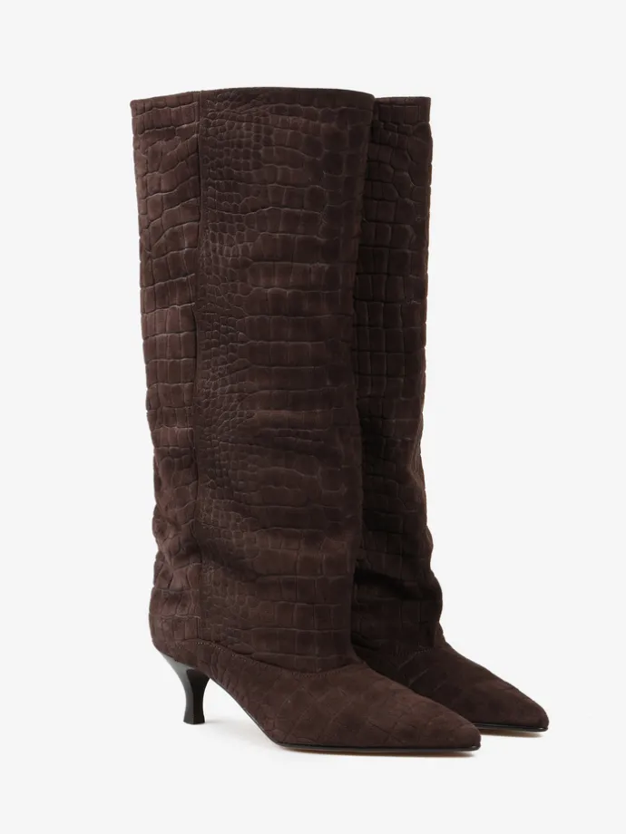 Kozaki na szpilce wykonane z zamszu tłoczonego w krokodyli wzór. Szeroka cholewka i noski w szpic.