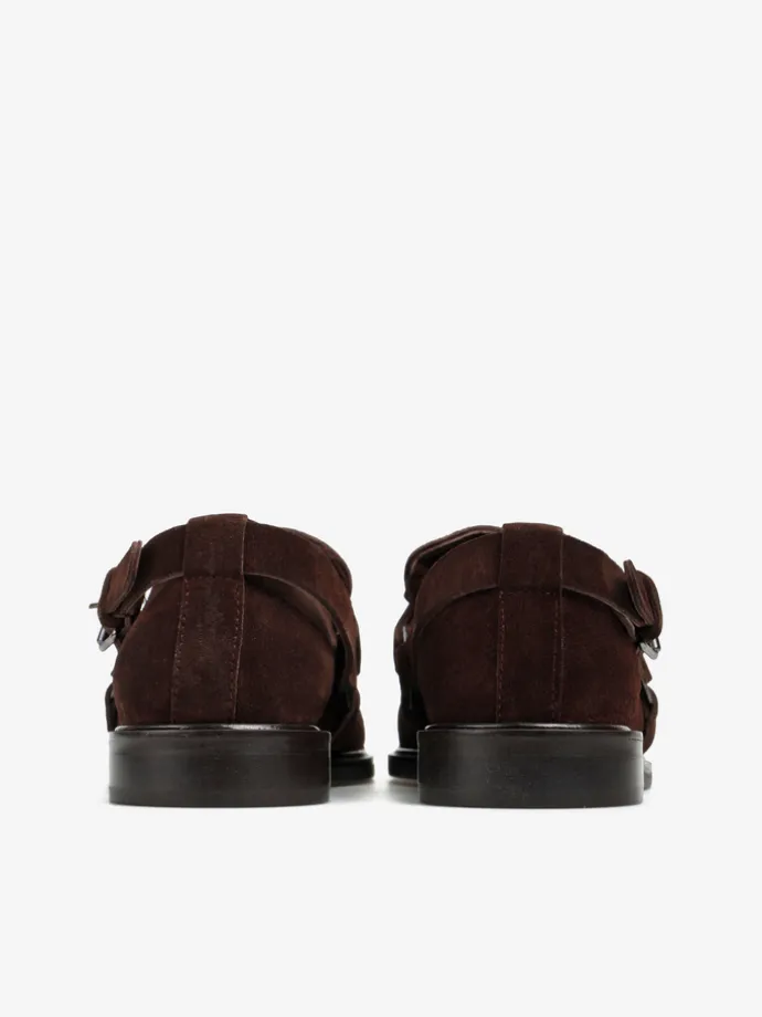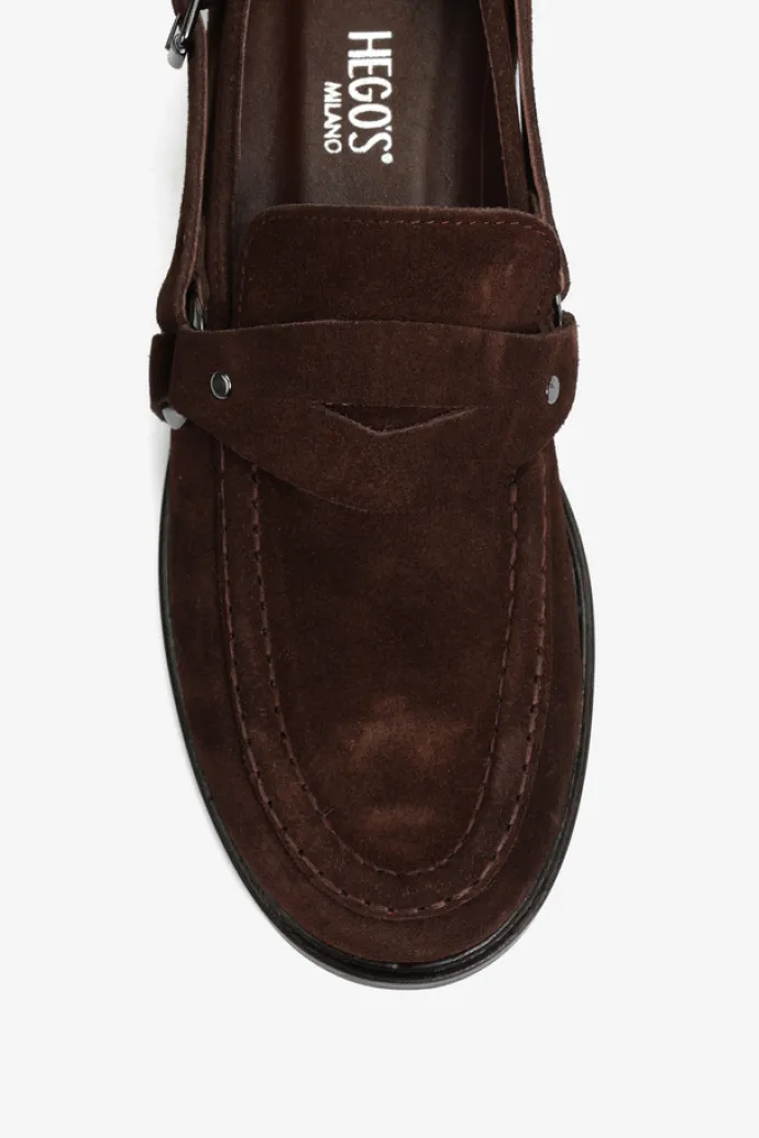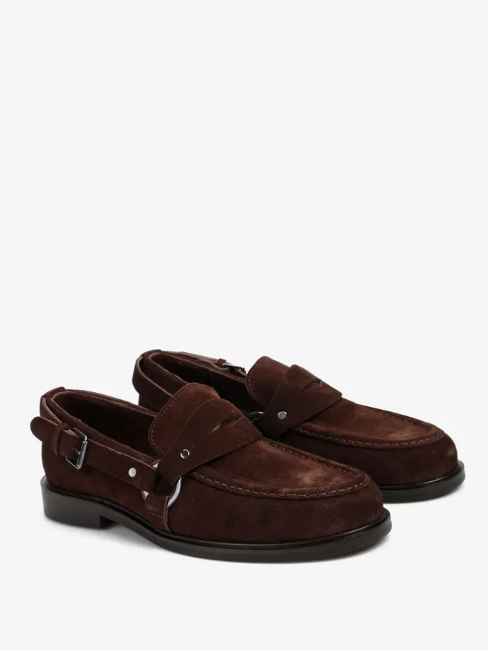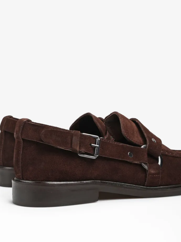 Mokasyny wykonane z czekoladowobrązowego zamszu. Ozdobna patka i pasek z wędzidłem z boku cholewki