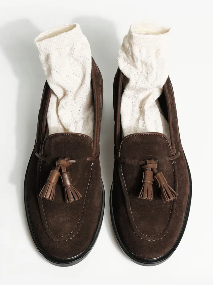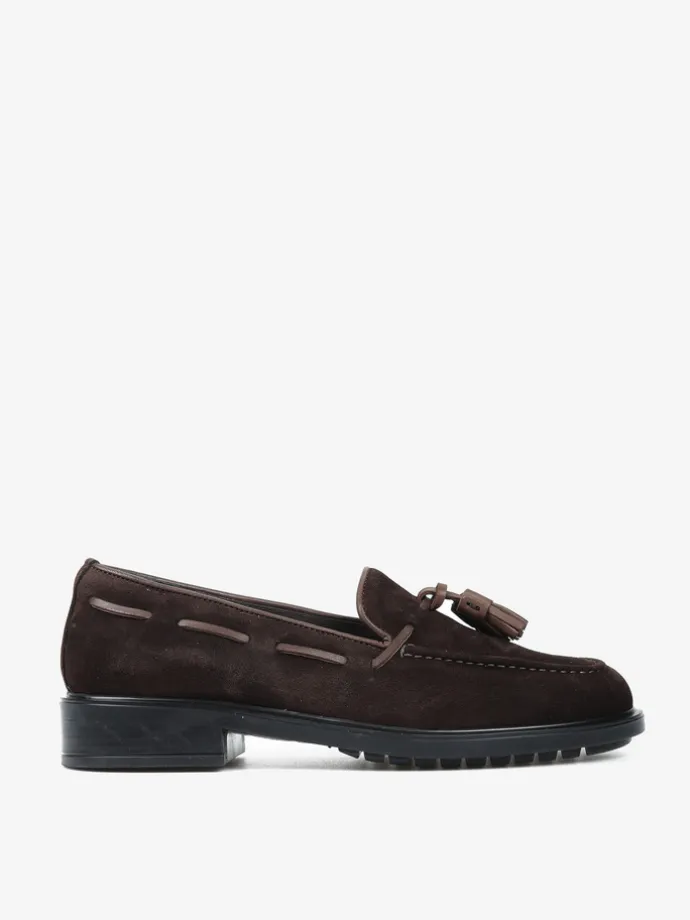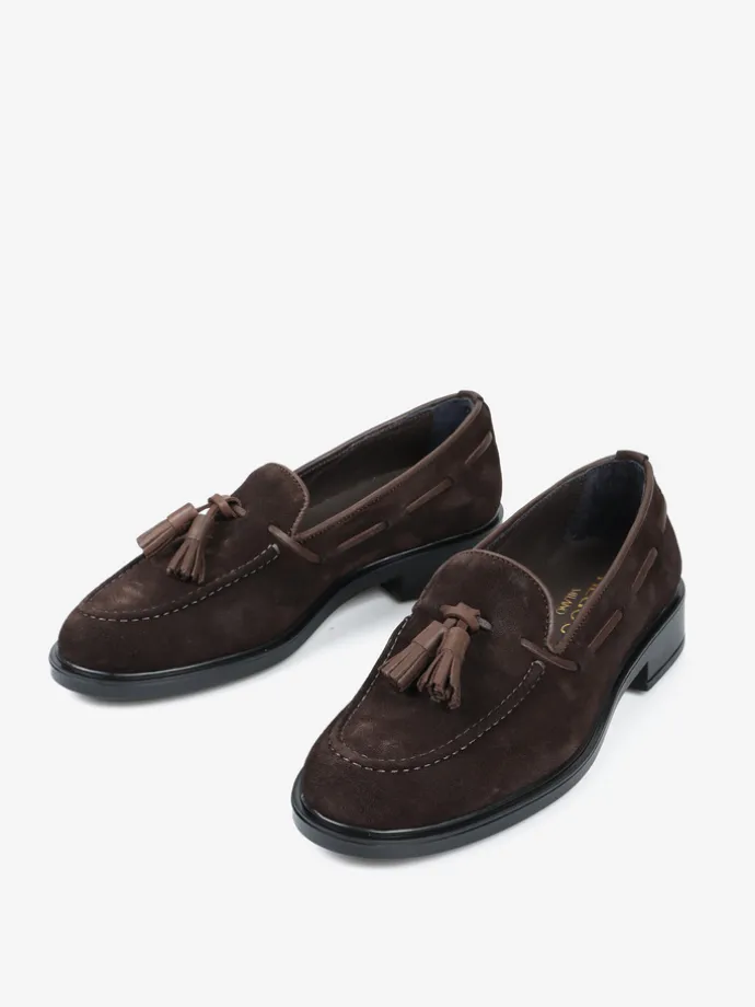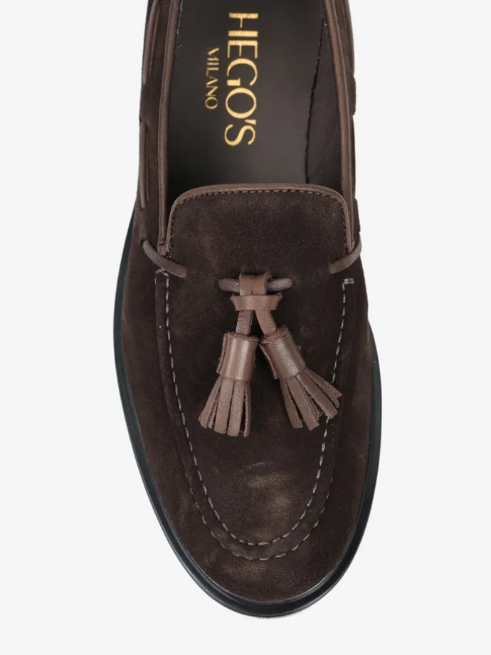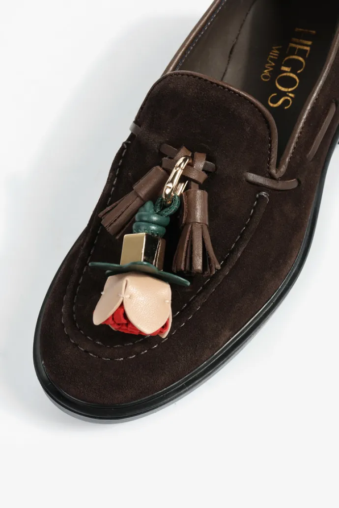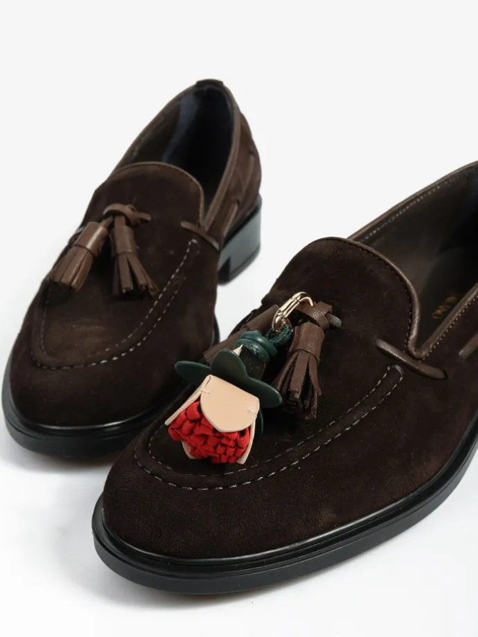 Zamszowe mokasyny z ozdobnym rzemykiem i frędzlami. Przywieszka dostępna oddzielnie.