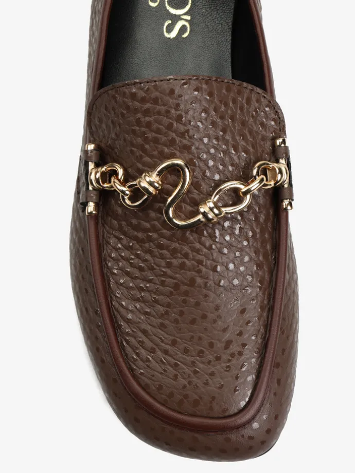Mokasyny z asymetrycznym noskiem i biżuteryjną aplikacją, wykonane z mięsistej skóry.