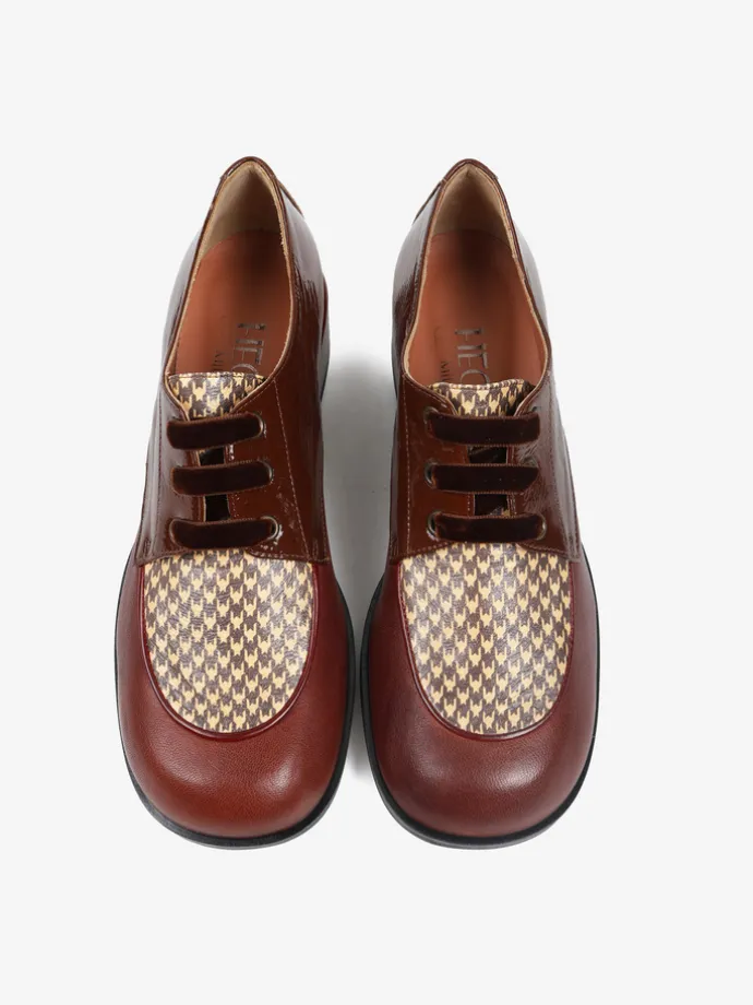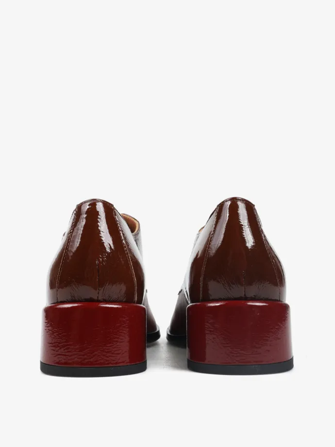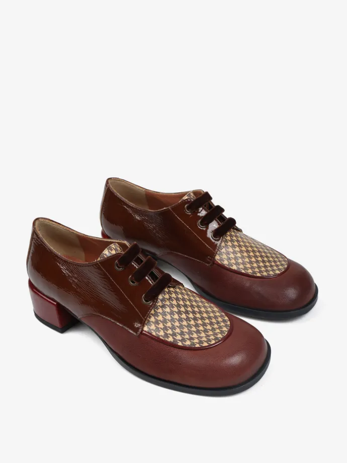 Półbuty na niskim słupku w odcieniach brązu i bordo. Kwadratowe noski, wzorzysty język i welurowe sznurowadła.