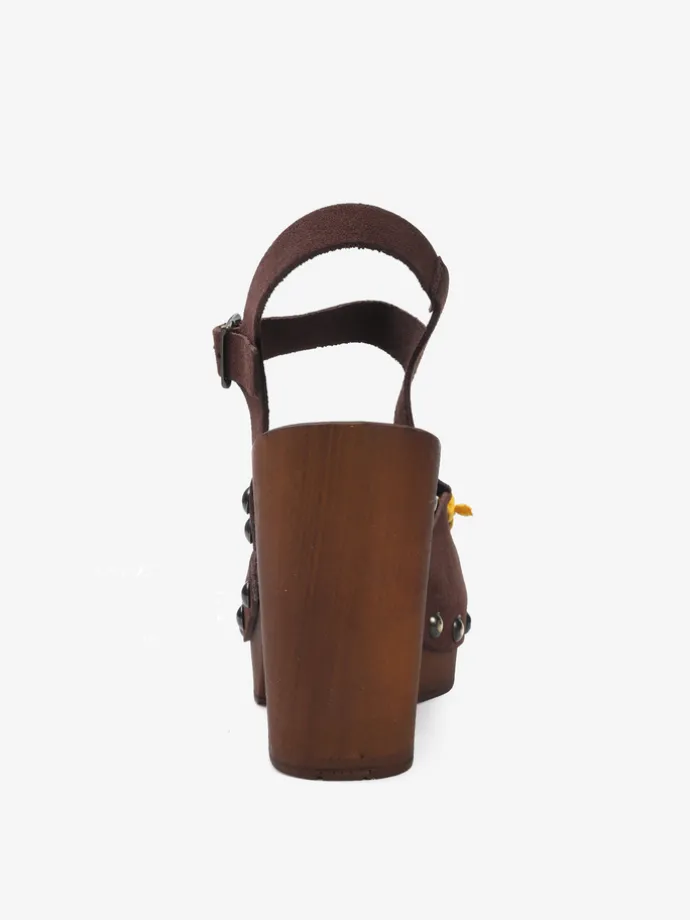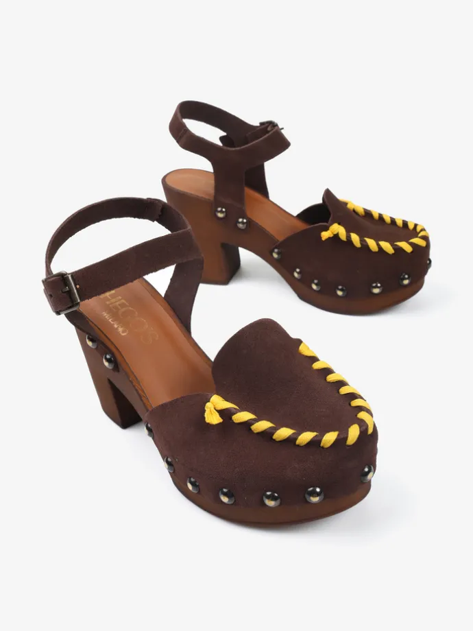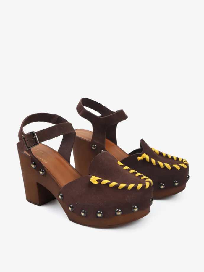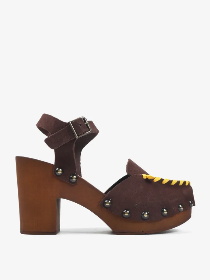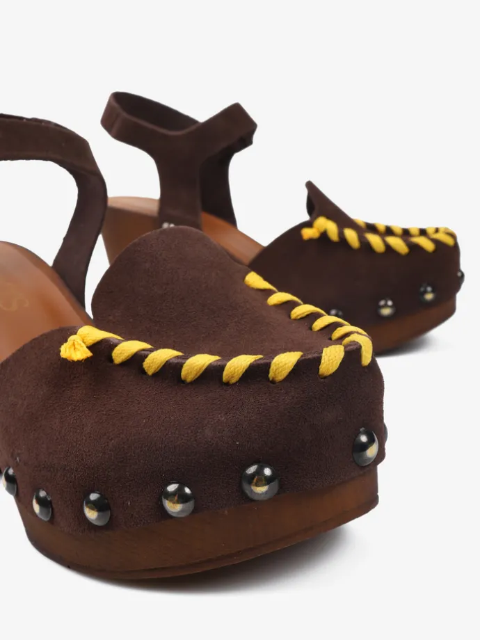 Zamszowe sandały w stylu chodaków. Ozdobne ćwieki i widoczny szew w kontrastującym kolorze.