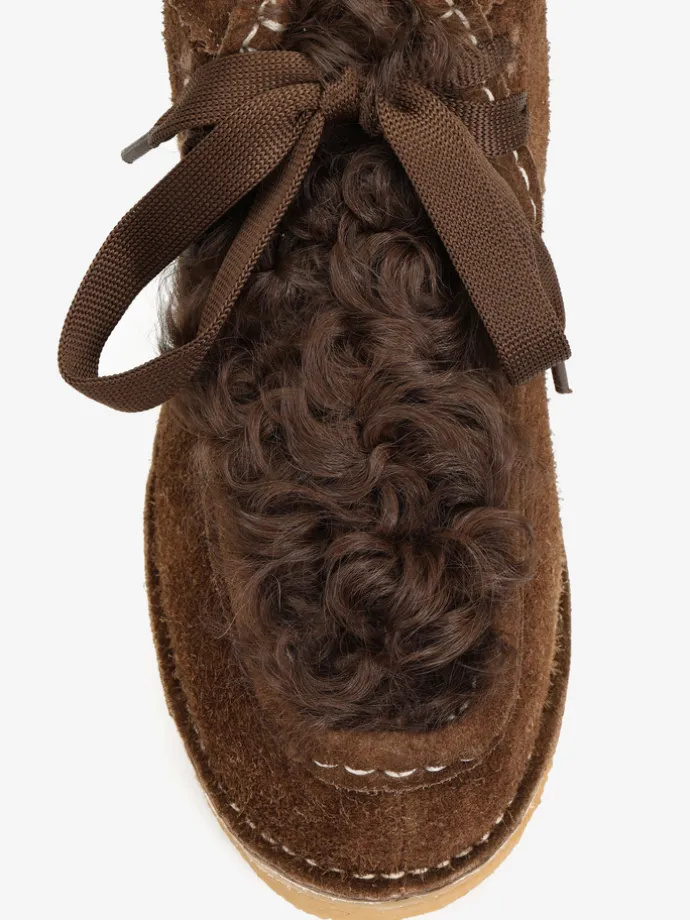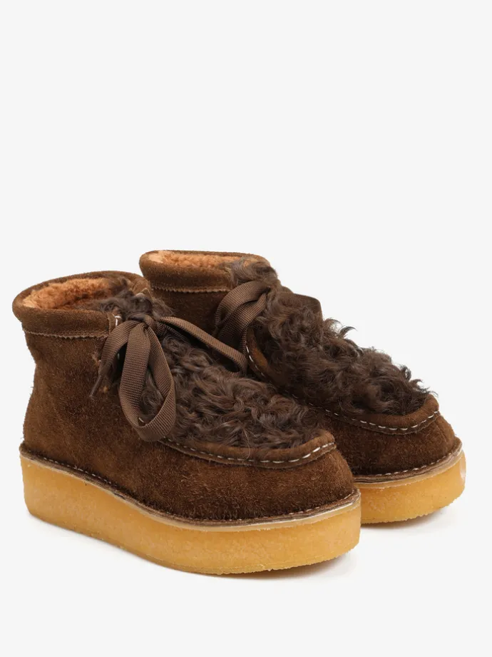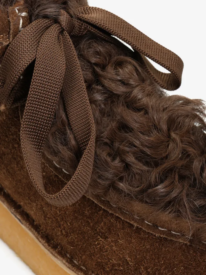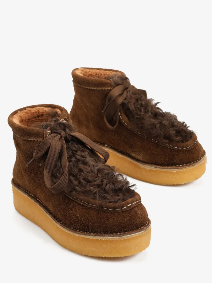 Zamszowe śniegowce na platofmie, wyłożone w środku tkaniną imitującą futro baranka. Wiązanie na sznurowadła.